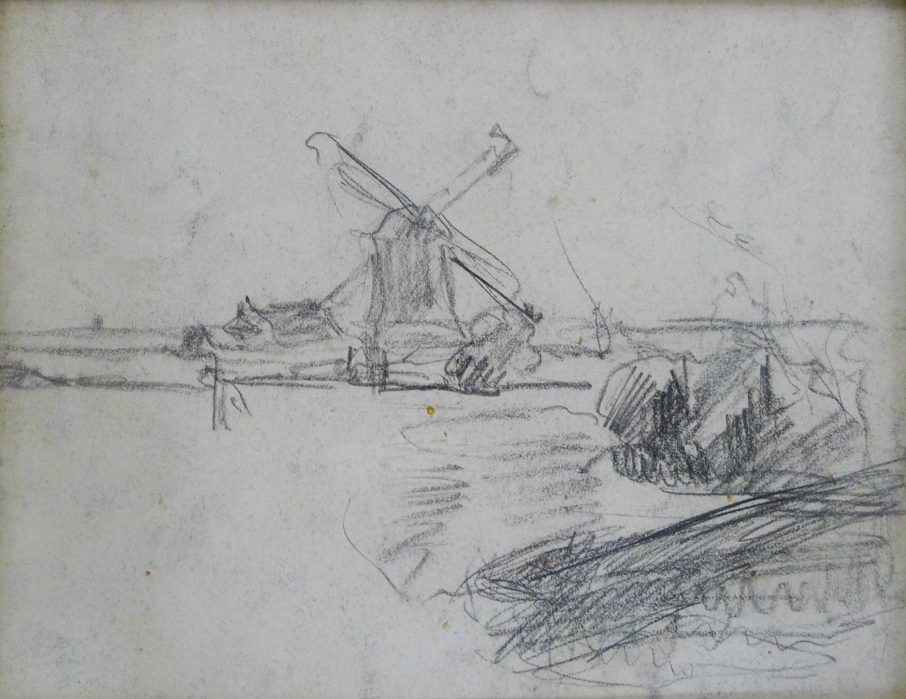 Weergave van een molen aan een meer of rivier. De wieken zijn duidelijk herkenbaar hoewel ze met slechts enkele lijnen zijn afgebeeld. Links van de molen aan de horizon is een gebouw weergegeven. Voor de molen zijn struiken waarneembaar. Ook aan de rechterkant is begroeiing, maar deze is door de toegepaste techniek moeilijk te onderscheiden. De tekening bestaat vooral uit dikke, duidelijke lijnen.
