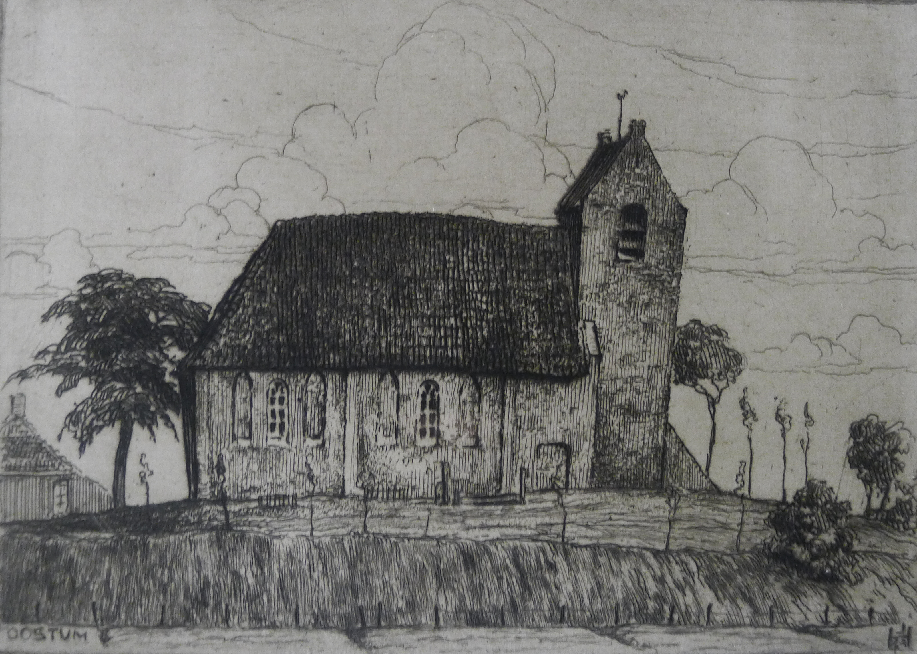 Zicht op het dertiende eeuwse in romaanse stijl gebouwde hervormde kerkje van Oostum op een wierde ten noorden van de stad Groningen. De kerk is centraal en donker afgebeeld, waardoor deze meteen de aandacht trekt. Om de kerk heen staan grote en kleinere bomen. Op de toren is een haan zichtbaar. Aan de linkerkant staat deels een huis. Duidelijk waar te nemen is de afgegraven wierde, wat weergegeven is door de vele verticale lijnen aan de onderkant van de ets. De ets is zeer gedetailleerd. De dakpannen zijn duidelijk te onderscheiden. Duidelijk zichtbaar is de scheven toren, die dwars staat op de kerk.
