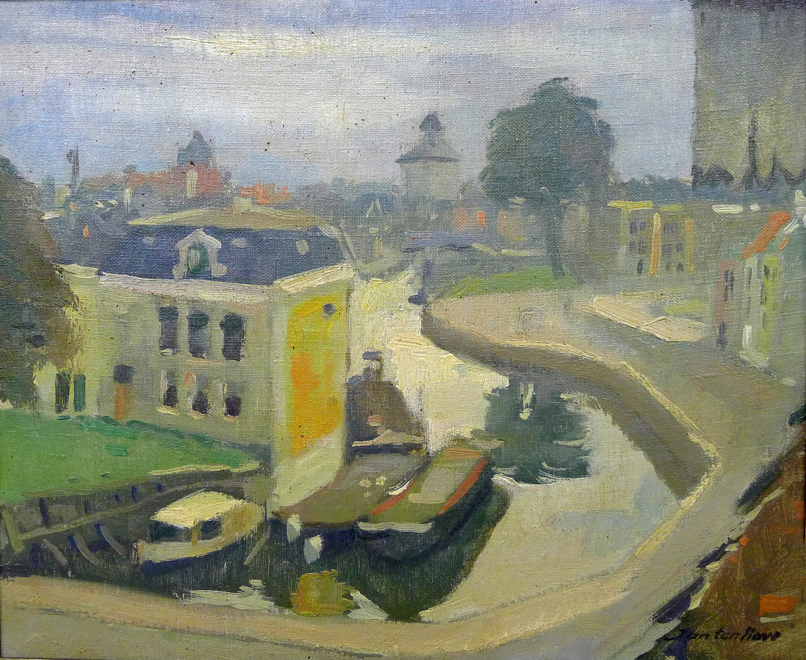 Zicht op een gracht, waarin enkele binnenvaartschepen aan de kade liggen. De gracht maakt een kleine bocht naar links en verdwijnt in het midden uit beeld. Vanaf de voorgrond loopt een weg naar rechts en daarna naar het midden van het kunstwerk. Zowel aan de rechterkant als links en aan de hoge horizon staan huizen. In het midden torent boven de stad een op een watertoren lijkend gebouw uit. Rechtsboven is een deel van een groot en hoog gebouw afgebeeld. De boom in het midden alsook de schepen en de lucht zijn in het rustige water weerspiegeld.