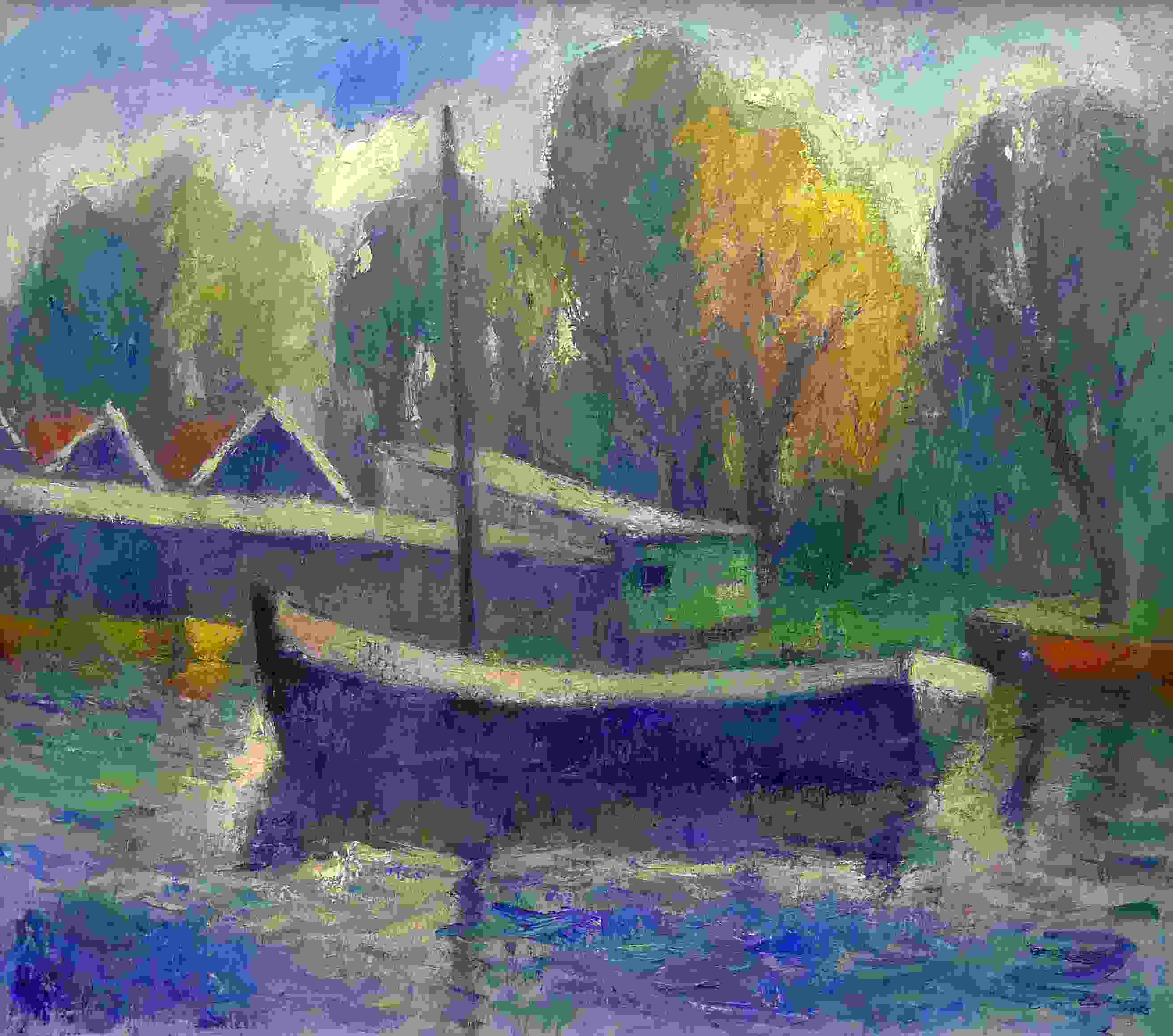 Kleurrijke weergave van een eenvoudig zeilbootje op het Zuidlaardermeer. Op de oever staan bomen, voor een deel in herfstkleuren, schuren en huizen met rode daken. Van de bomen zijn de grotere takken duidelijk weergegeven. Het bootje, de lucht en de bomen aan de rechterkant zijn weerspiegeld in het water. In de lucht wisselen stukken blauw en witte stapelwolken elkaar af.