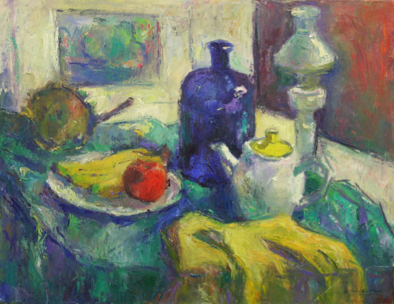 Stilleven van een blauwe fles, witte theepot met geel deksel, een witte kandelaar en een witte schaal met bananen en een rode appel. Tegen de muur ligt een bruinkleurige kalebas. De voorwerpen liggen op een blauwgroen kleed met op de voorgrond een geel kleed. Aan de muur hangt een schilderij van een landschap.