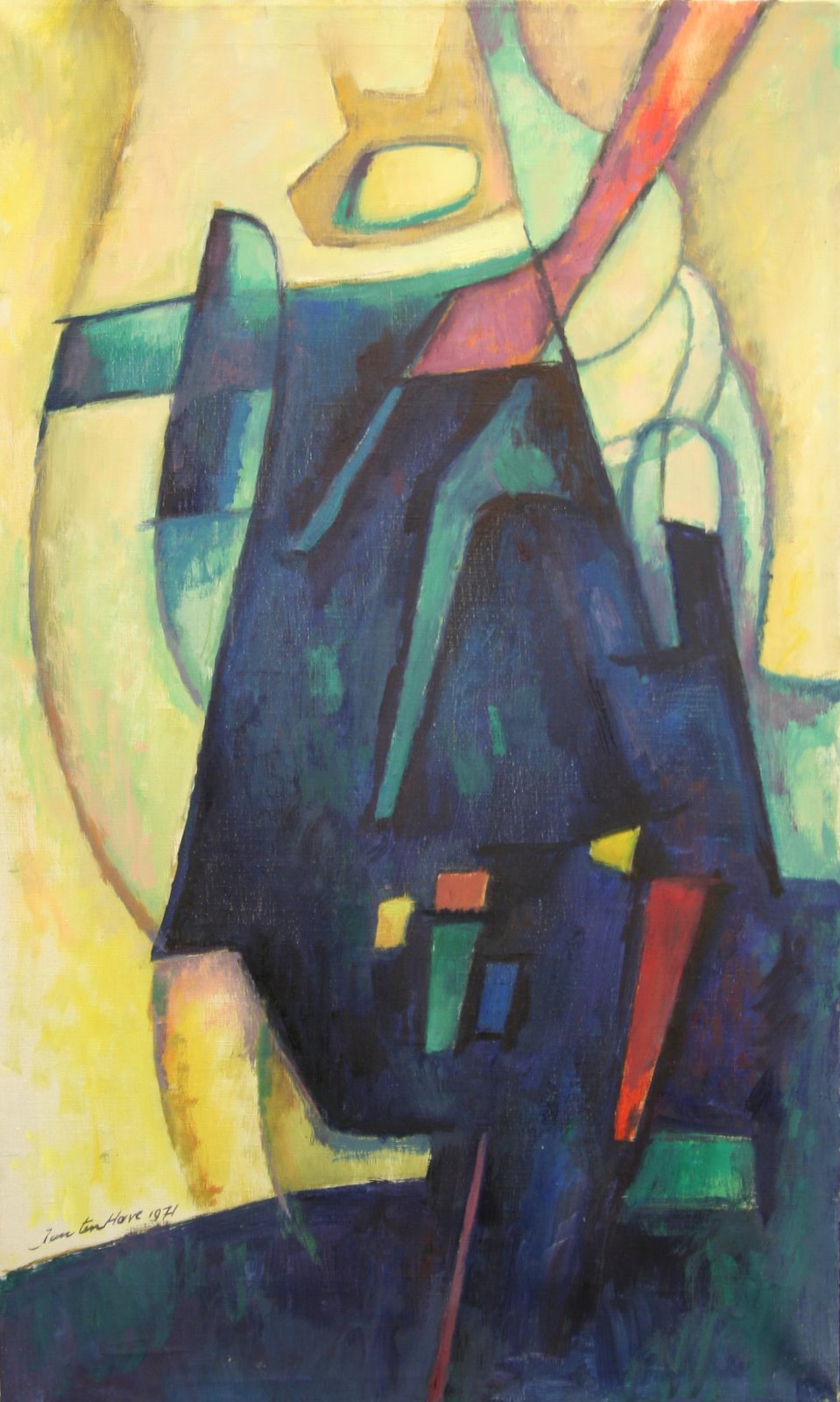 Compositie van een persoon of dier met abstracte elementen, waardoor het niet duidelijk is, wat is afgebeeld. Misschien heeft Jan ten Have dit bewust gedaan om de kijker te verwarren. De figuur valt door de donkere, vooral blauwe kleuren tegen de lichte, gele achtergrond meteen op. De figuur lijkt in een pak gekleed te zijn. Het hoofd is licht van kleur, wat ook geldt voor de rechterkant van de figuur. De vlakken zijn met duidelijke lijnen afgebeeld.