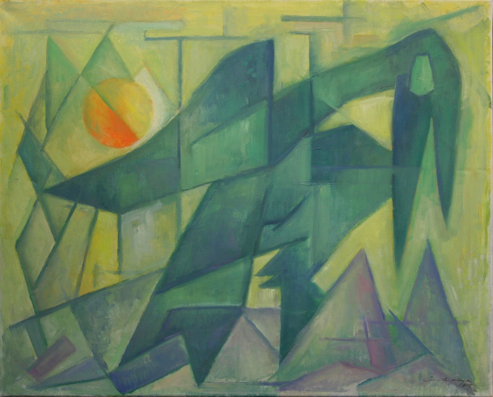 Abstracte compositie in vooral groene en gele kleuren. In het midden trekt een groene vogel de aandacht. Aan de rechterkant is de kop waar te nemen. De vlakken van deze vogel zijn donker, wat contrasteert met de lichte kleuren eromheen. Links van de vogel is een geeloranje bol afgebeeld, die de zon voorstelt. De meeste vlakken hebben een duidelijke lijn.