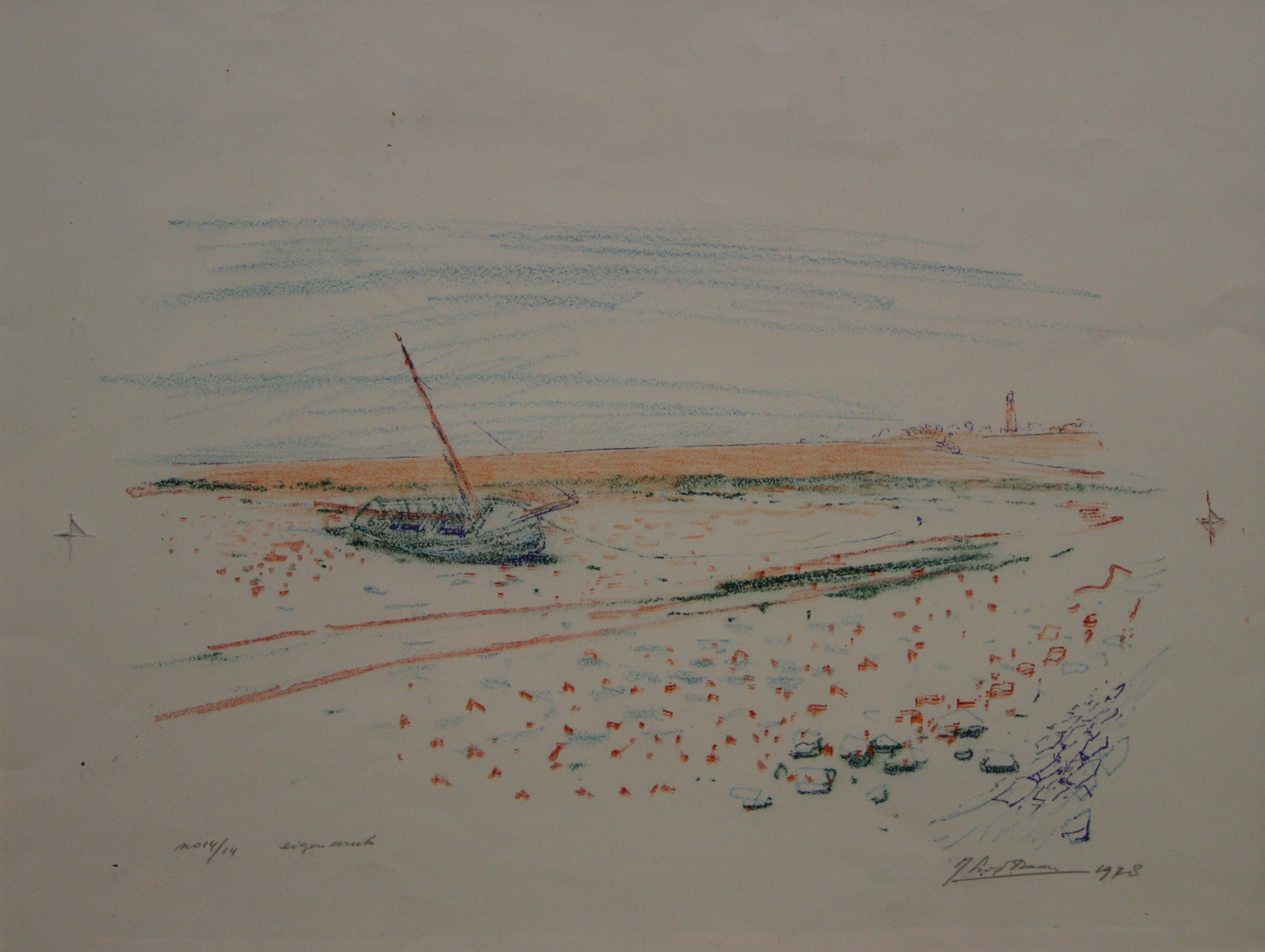 Door het grotendeels lege kunstwerk krijgen juist het bootje, dat het meest gedetailleerd is afgebeeld, en de duinen meer nadruk.