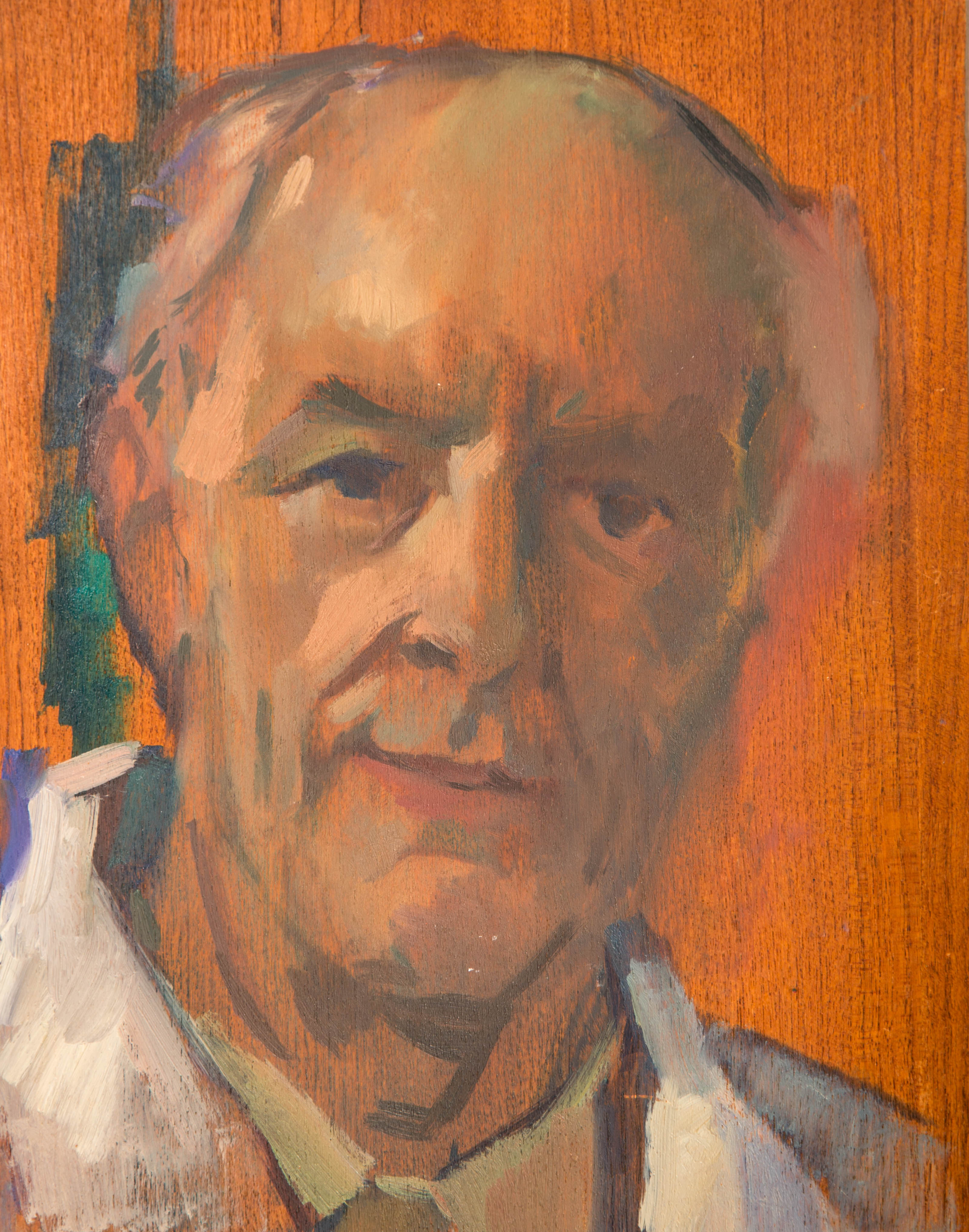 Zelfportret en face als studie. De kunstenaar heeft donkere ogen, grijs haar en heeft een vriendelijke uitstraling. Hij is kalend. Alleen aan de zijkanten van zijn hoofd is er haargroei. Hij is gekleed in een grijsgroen overhemd en een witte colbert. Het kunstwerk is heel duidelijk een studie. Op veel plekken is de houten ondergrond door de verf te zien. Ook is er geen achtergrond aangebracht, waardoor om het gezicht heen het houten paneel zichtbaar is.