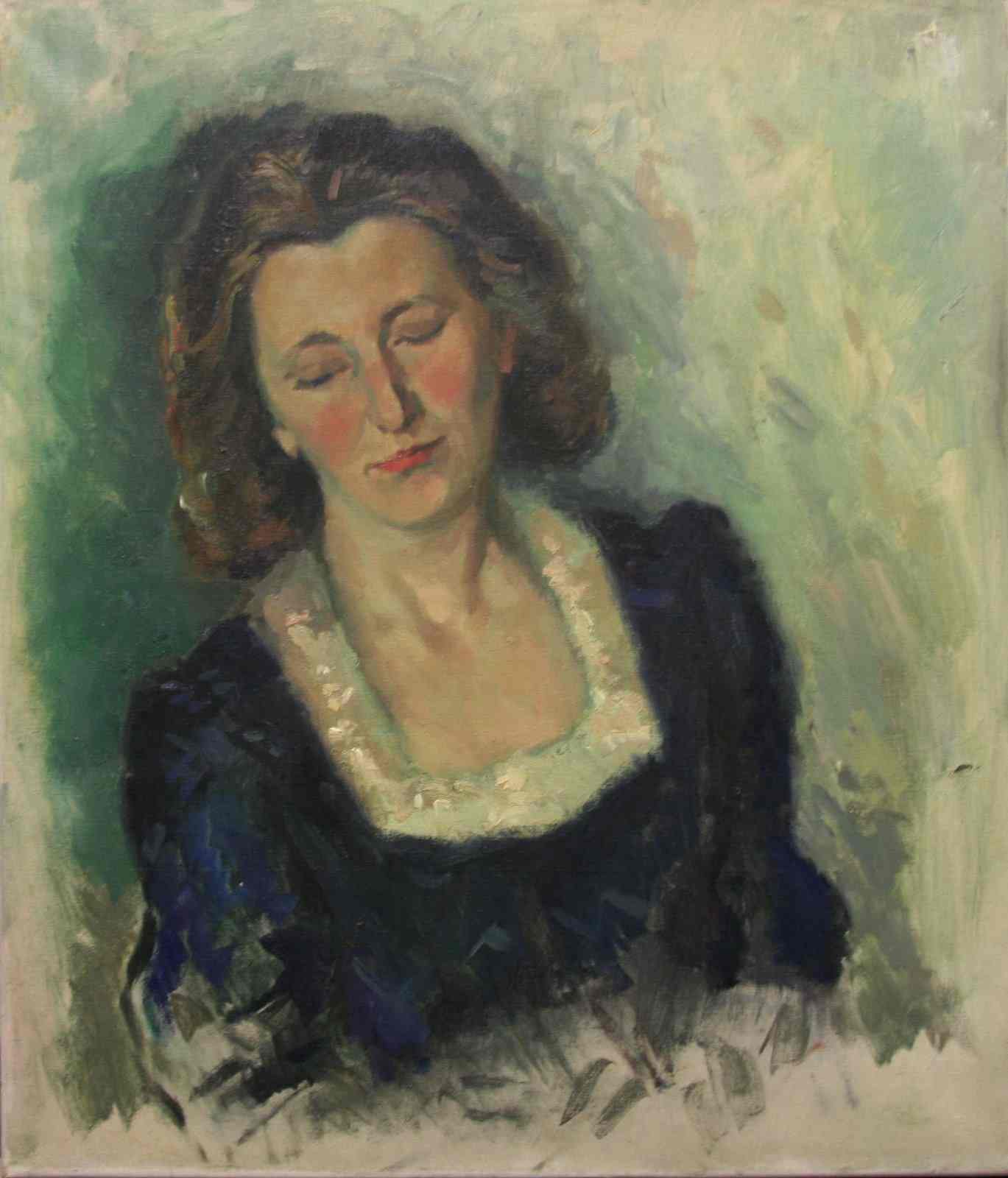 Portret van Sjoukje ten Have, de vrouw van de kunstenaar Jan ten Have. Zij heeft haar ogen gesloten. Ze heeft donkerbruin halflang haar en een rode blos op haar wangen. Ze heeft een rustige, tevreden uitstraling. Ze draagt een donkerblauwe jurk met een witte rand. Het werk lijkt niet voltooid door de verfstrepen aan de onderkant. Sjoukje ten Have is afgebeeld op jonge leeftijd.