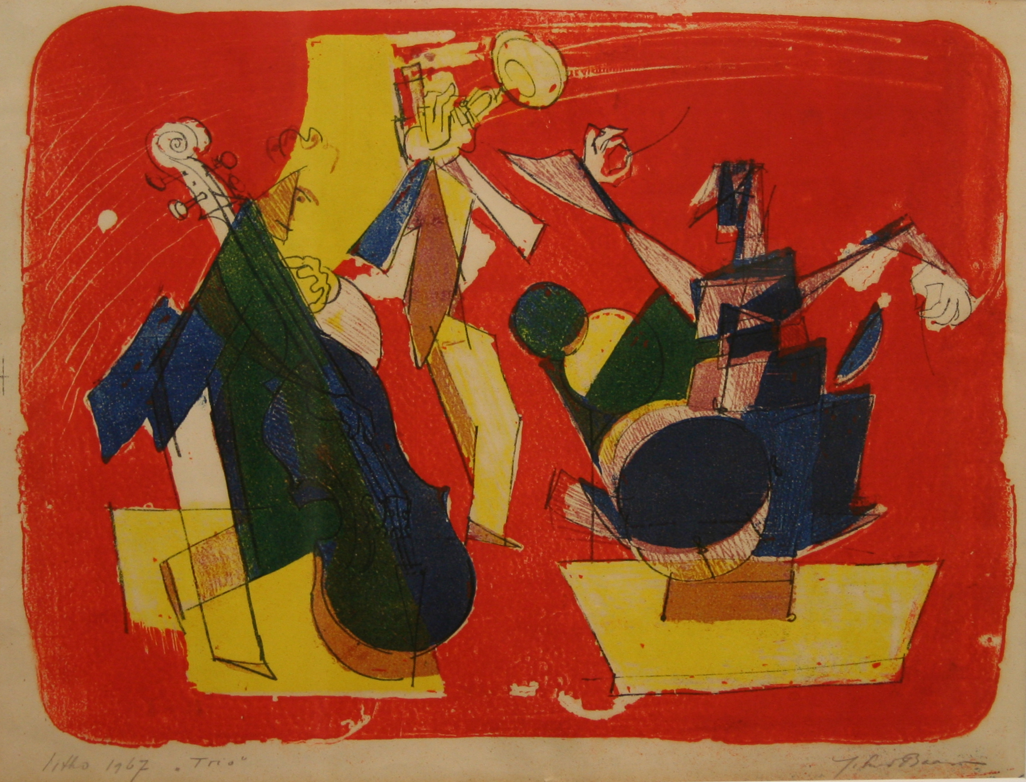 Abstracte weergave van een trio muzikanten. De linker figuur is grotendeels verborgen achter de contrabas, de middelste figuur speelt trompet en de rechter figuur bespeelt een drumstel. Van alle muzikanten zijn de handen afgebeeld. De rechter figuur is echter het meest herkenbaar.