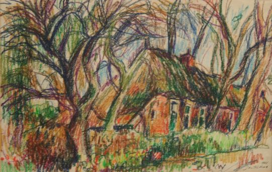 Zicht op een huis dat omringd is door bomen. Het huis heeft groene deuren en een rieten dak, dat aan de zichtzijde langer doorloopt dan aan de voorzijde. Tussen de bomen groeien struiken.
