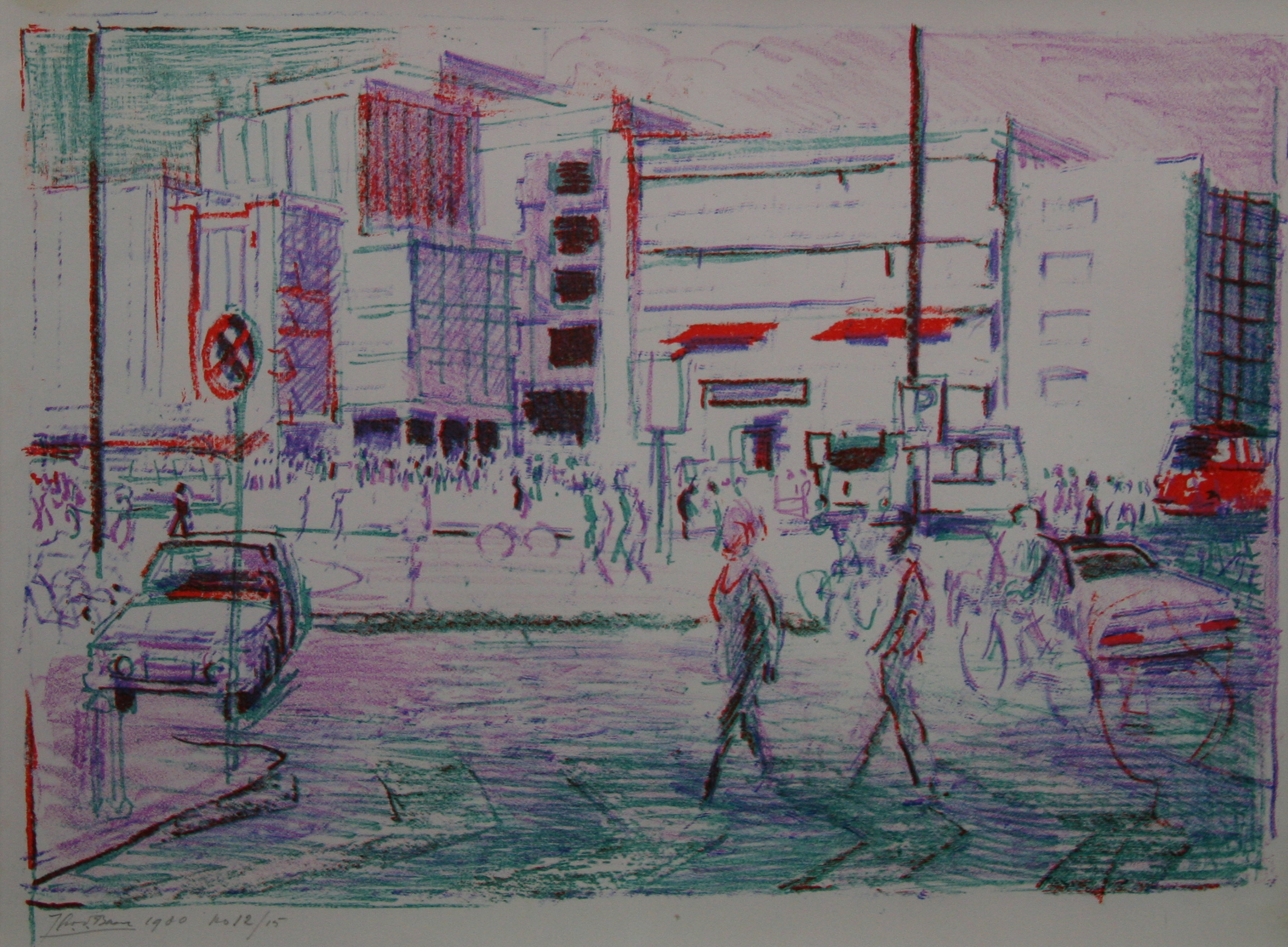 De gebouwen en figuren zijn met dikkere en dunne lijn aangebracht. Vaak lijken het verzamelingen krassen te zijn. De arcering in het wegdek en de schaduwzijde van de gebouwen benadrukken dit feit.