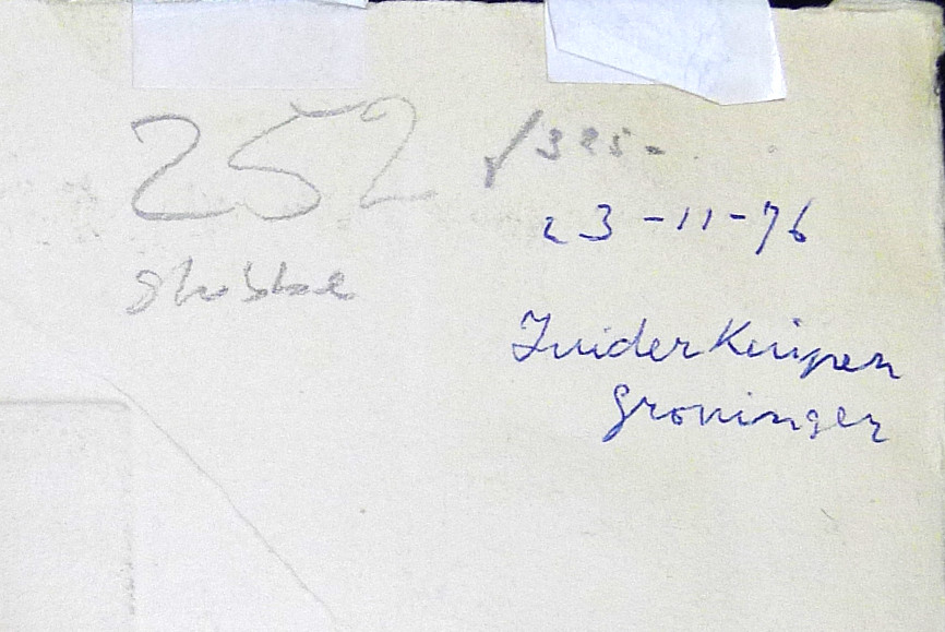 | opschrift | linksonder epreuve d'artiste, achterkant: Zuiderkuipen Groningen, Stubbe, f. 325,- 23-11-'76 |