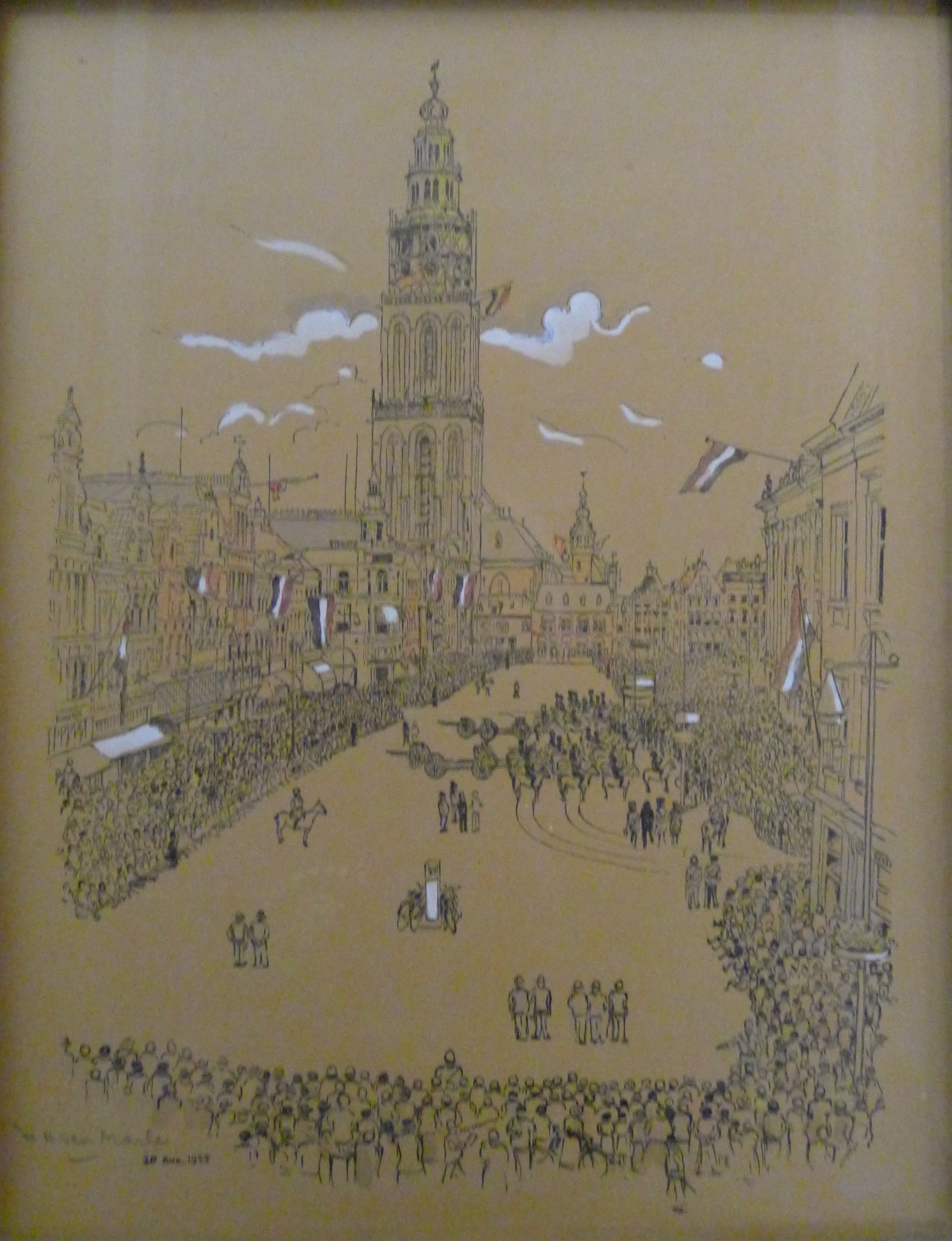 De tekening is zeer gedetailleerd: afzonderlijke mensen zijn weergegeven, alsook de ramen en gevels van de gebouwen. Opvallend is het witgehoogde in de wolken en vlaggen. In de vlaggen is ook het rood en blauwe duidelijk zichtbaar. De gebouwen hebben lichte tinten roodbruin en de daken zijn lichtgrijs.