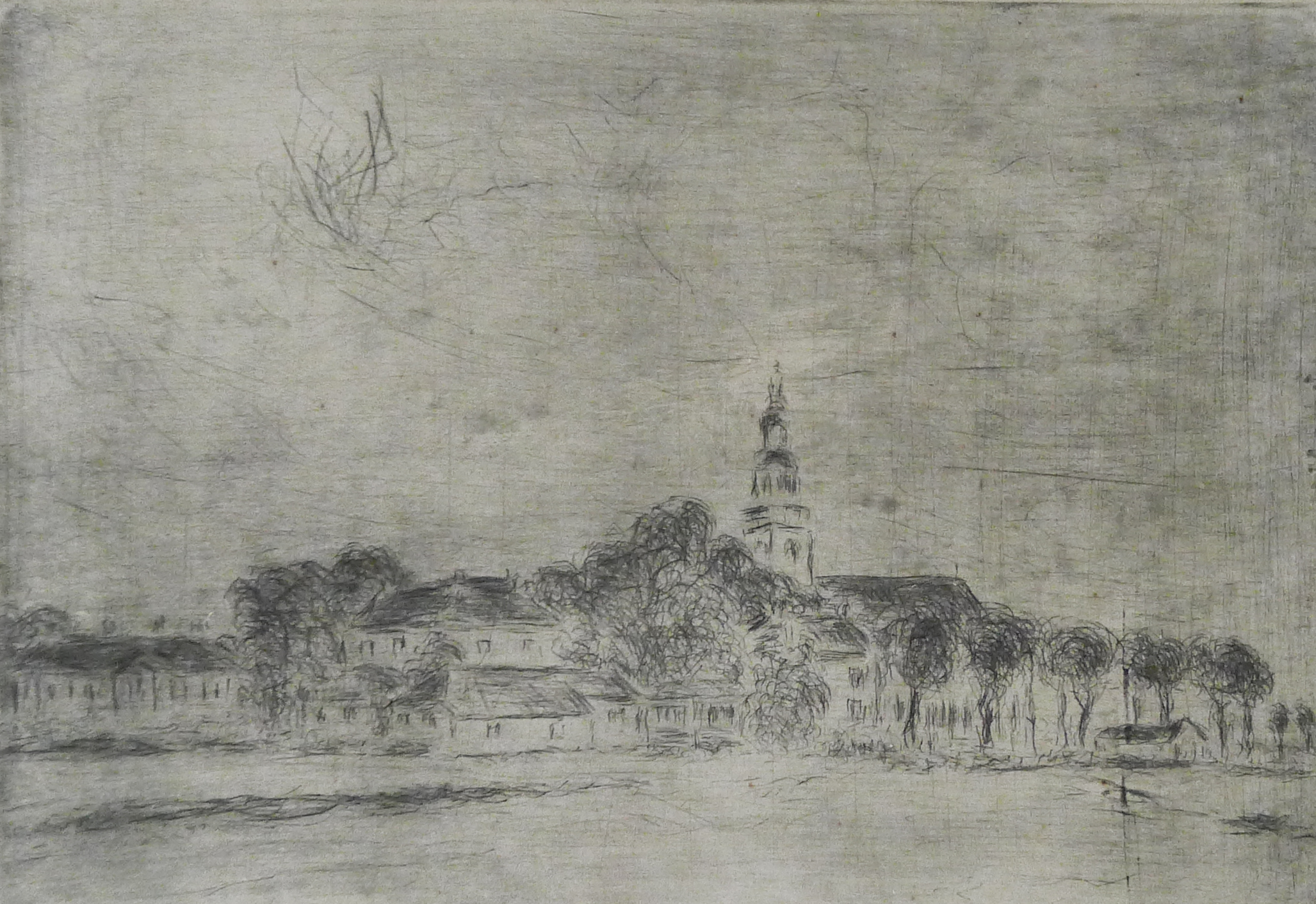 Door de lage horizon wordt het grootste deel van de ets ingenomen door lucht. De gebouwen zijn met rechte lijnen afgebeeld, terwijl de bomen in vele ronde lijnen zijn afgebeeld.