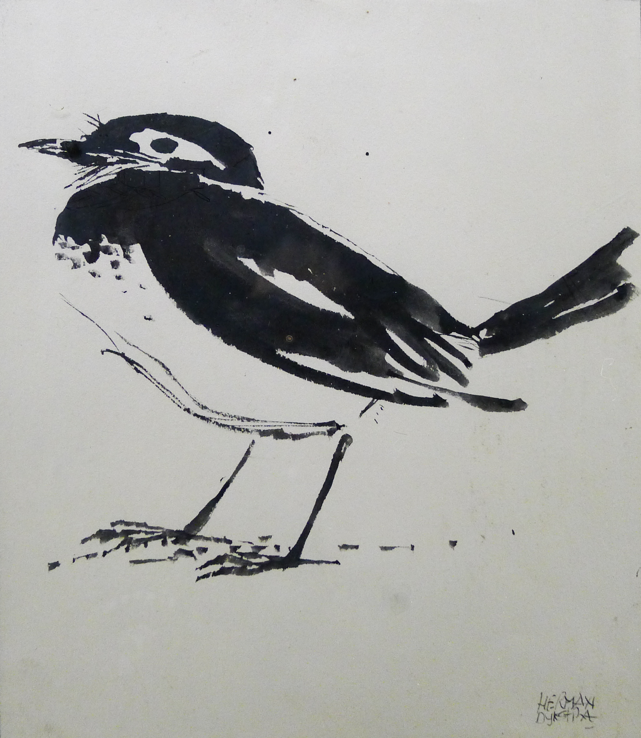 Het kopje, de vleugels en de staart zijn met dikke, duidelijke strepen afgebeeld. De buik daarentegen is met dunnen lijnen aangeduid.