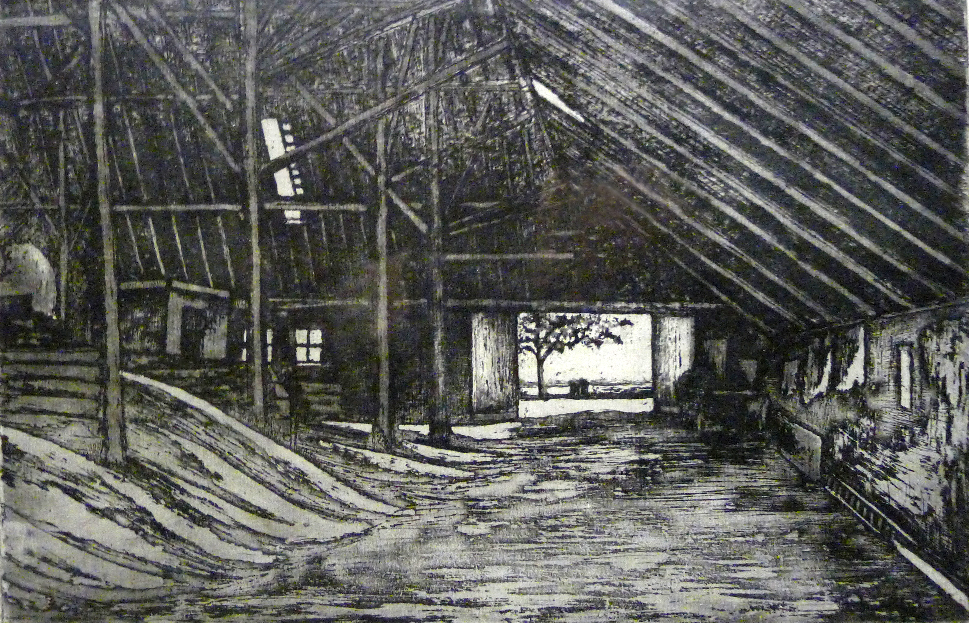Er is een duidelijk perspectief, dat versterkt wordt door de geopende schuurdeuren en de palen. De schuur lijkt enorm hoog te zijn door het niet volledig afgebeelde dak bovenaan.