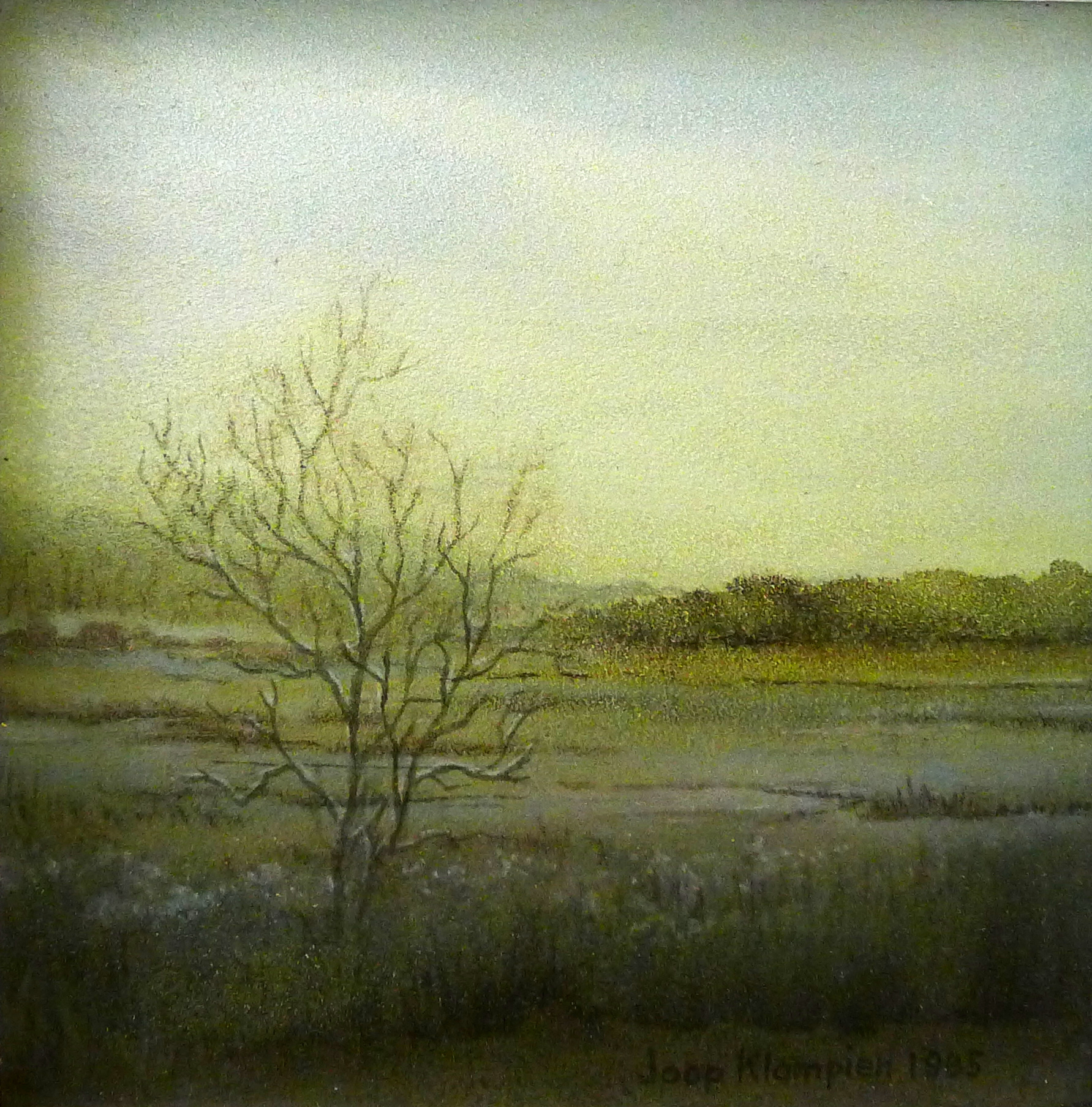 Het is winter wat blijkt uit de sneeuw die op de takken van de boom en het hoge gras ligt. Het is licht bewolkt. Tussen de lichte, dunne wolken is de blauwe lucht zichtbaar. Het kunstwerk is gedetailleerd. De takken van de kale boom en de grassprieten zijn duidelijk te onderscheiden. Er is weinig variatie in kleuren. Vooral de kleurencombinaties bruingroen en witblauw zijn gebruikt. Het creëert een sfeer van rust en wijdsheid.