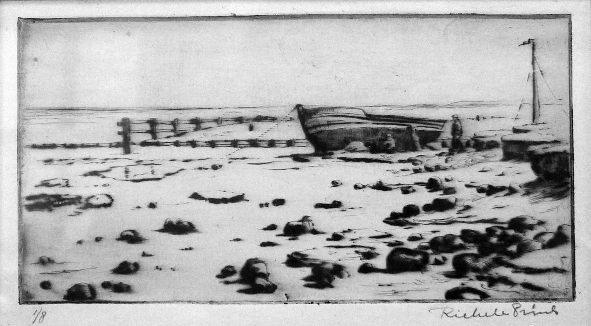 Zicht op twee kleine boten die half op het droge liggen. Het rechter bootje heeft een mast met in de top een vlaggetje. Bij het linker bootje staan een paar personen, die aan het bootje lijken te werken. Aan de rechterkant is een deel van de hoge oever zichtbaar. Achter de bootjes loopt over de hele breedte van de ets een laag hekje, waarop dwars een wat hoger houten hek is geplaatst. Op de voorgrond liggen stenen of stukken grond die drooggevallen lijken.
