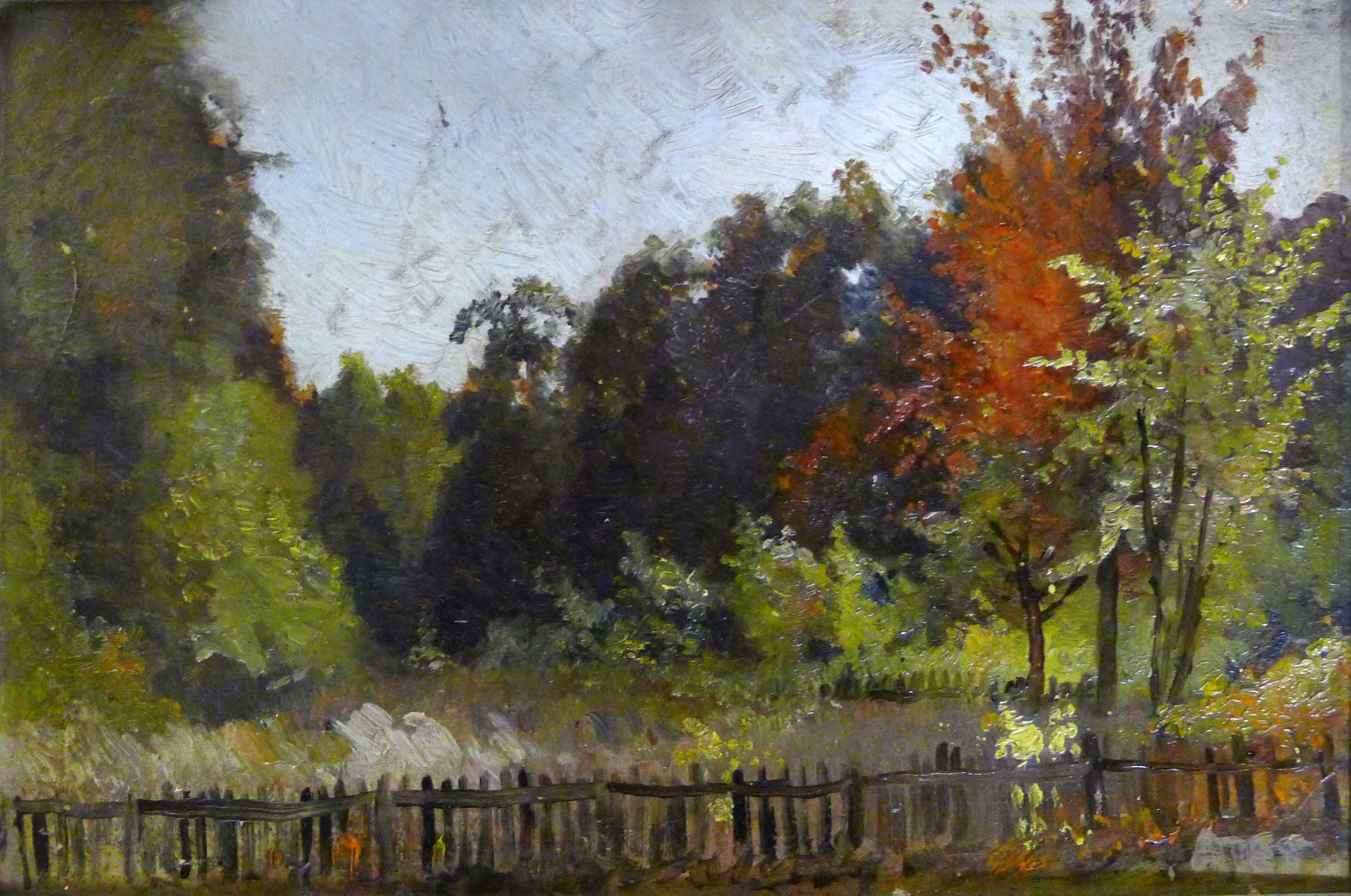De kunstenaar heeft vooral de bomen aan de rechterkant gedetailleerd afgebeeld. De afzonderlijke bladeren zijn grotendeels te onderscheiden. Verderop zijn de bladeren door de verder afgebeelde bomen meer samengevoegd tot één groot gebladerte. De palen van het hek zijn met brede penseelstrepen afgebeeld. Dit geldt ook voor de blauwwitte lucht.