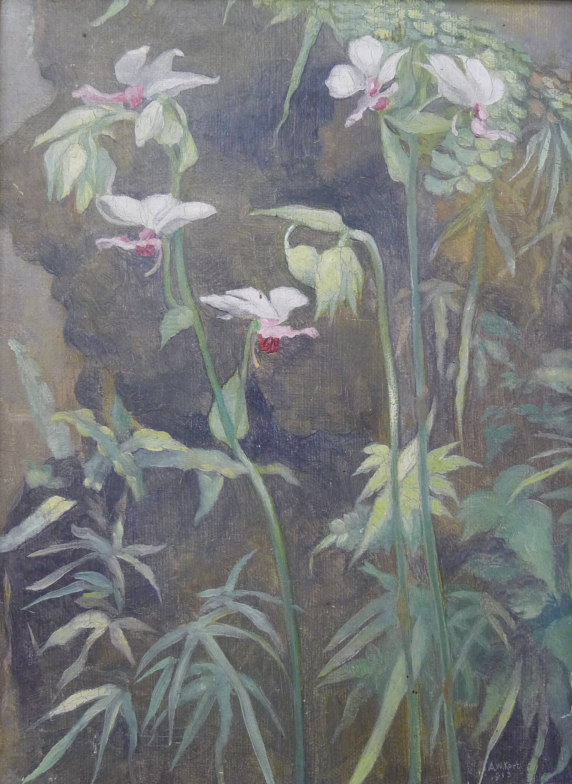 Stilleven van enkele orchideeën. Deze zijn over het gehele werk afgebeeld. In de bovenste helft zijn vijf wit-roze bloemen weergegeven. Van een paar zijn de donkerrode meeldraden te zien. Er zijn een paar bloemen nog in de knop. Veel bladeren en stengels zijn duidelijk herkenbaar. De lichte bloemen en planten contrasteren met de donkerbruine achtergrond.