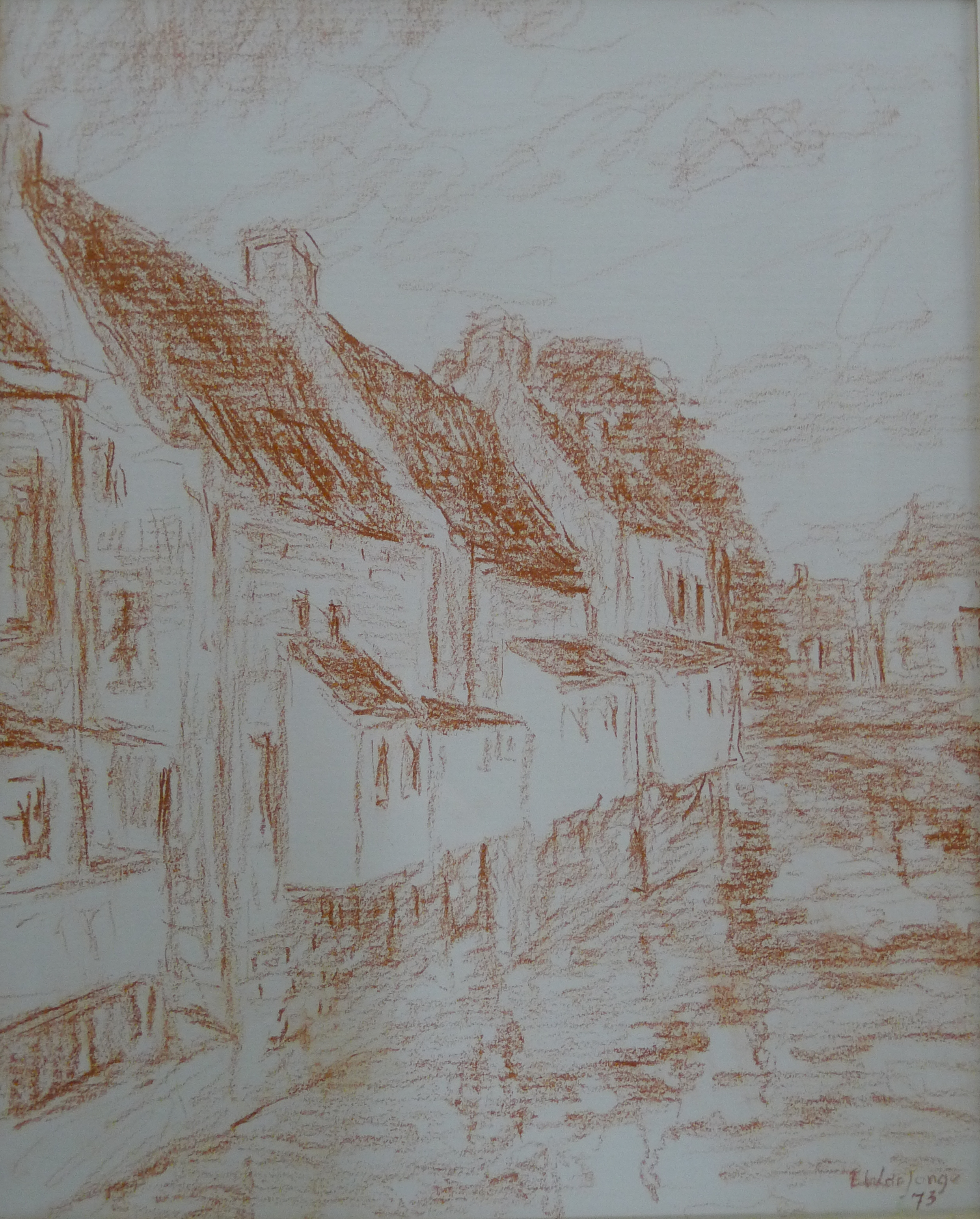 De huizen zijn met meerdere dunne lijnen weergegeven. In de daken zijn de vele afzonderlijke aangebrachte lijnen ook duidelijk te onderscheiden.