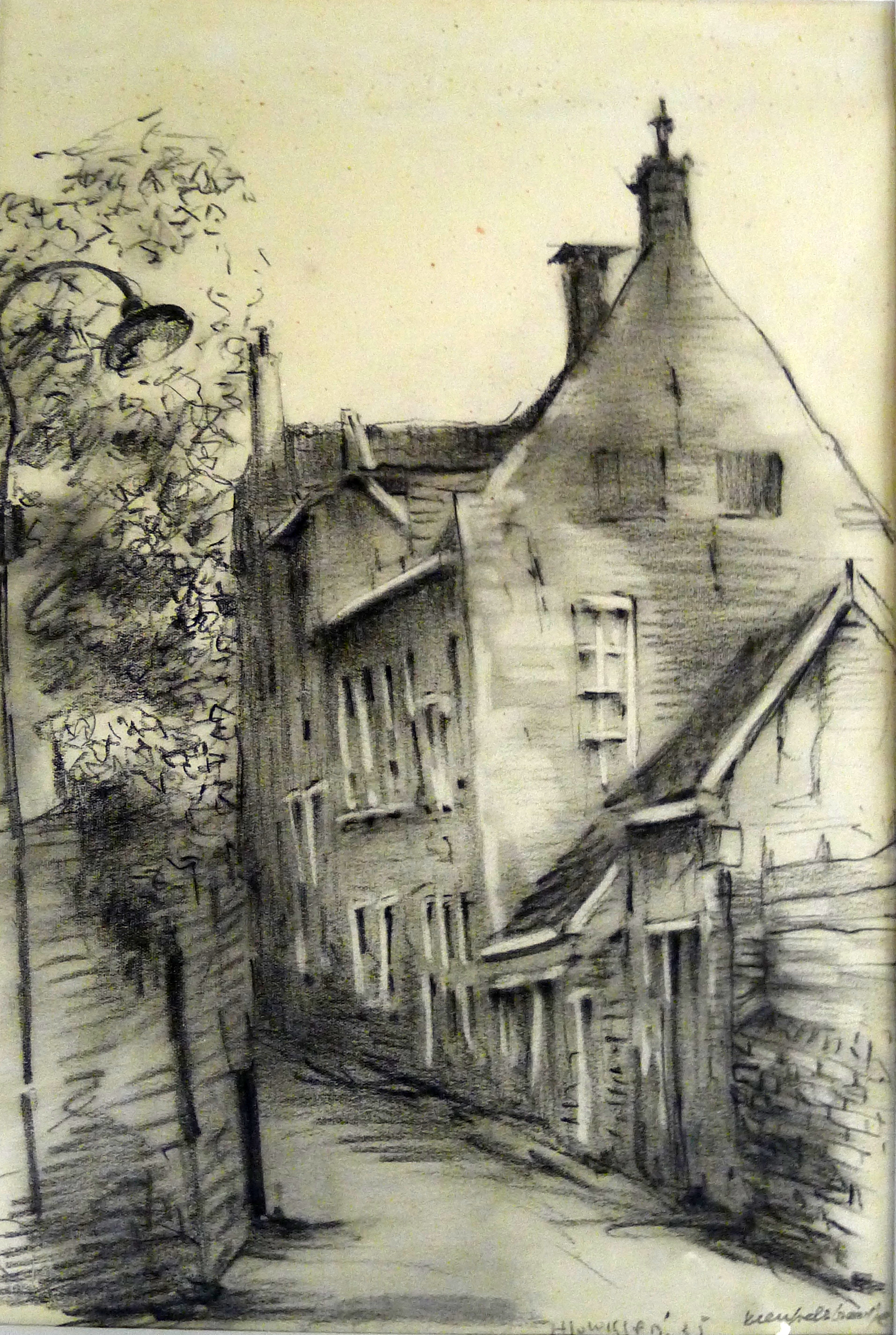 De tekening bevat vooral in de huizen details. De straat, de zijgevel, schutting en boom zijn met snel aangebrachte strepen aangebracht.