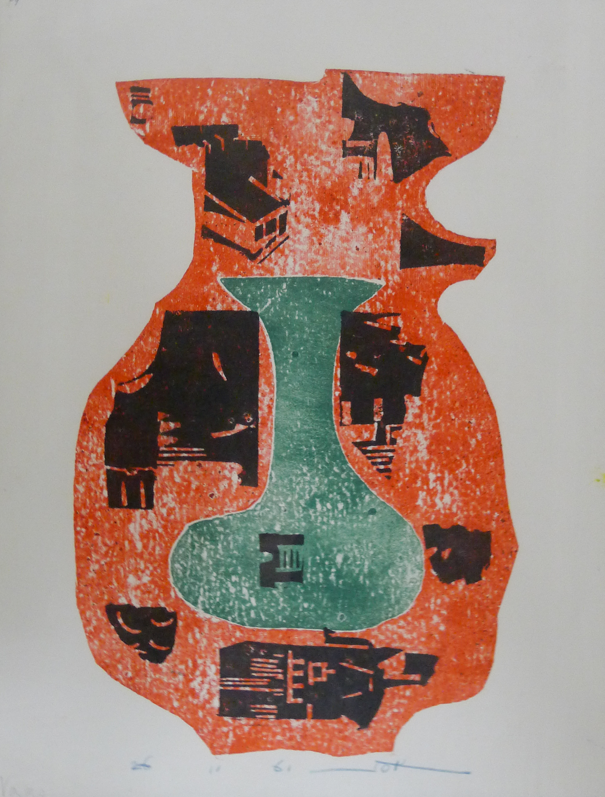 Abstracte weergave van een groene vaas. Deze vaas is omringd door een oranje vlak, dat ook op een vaas lijkt. In dit vlak zijn meerdere zwarte abstracte figuren in verschillende groottes afgebeeld. In de groene vaas is één kleine zwarte abstracte figuur geplaatst.