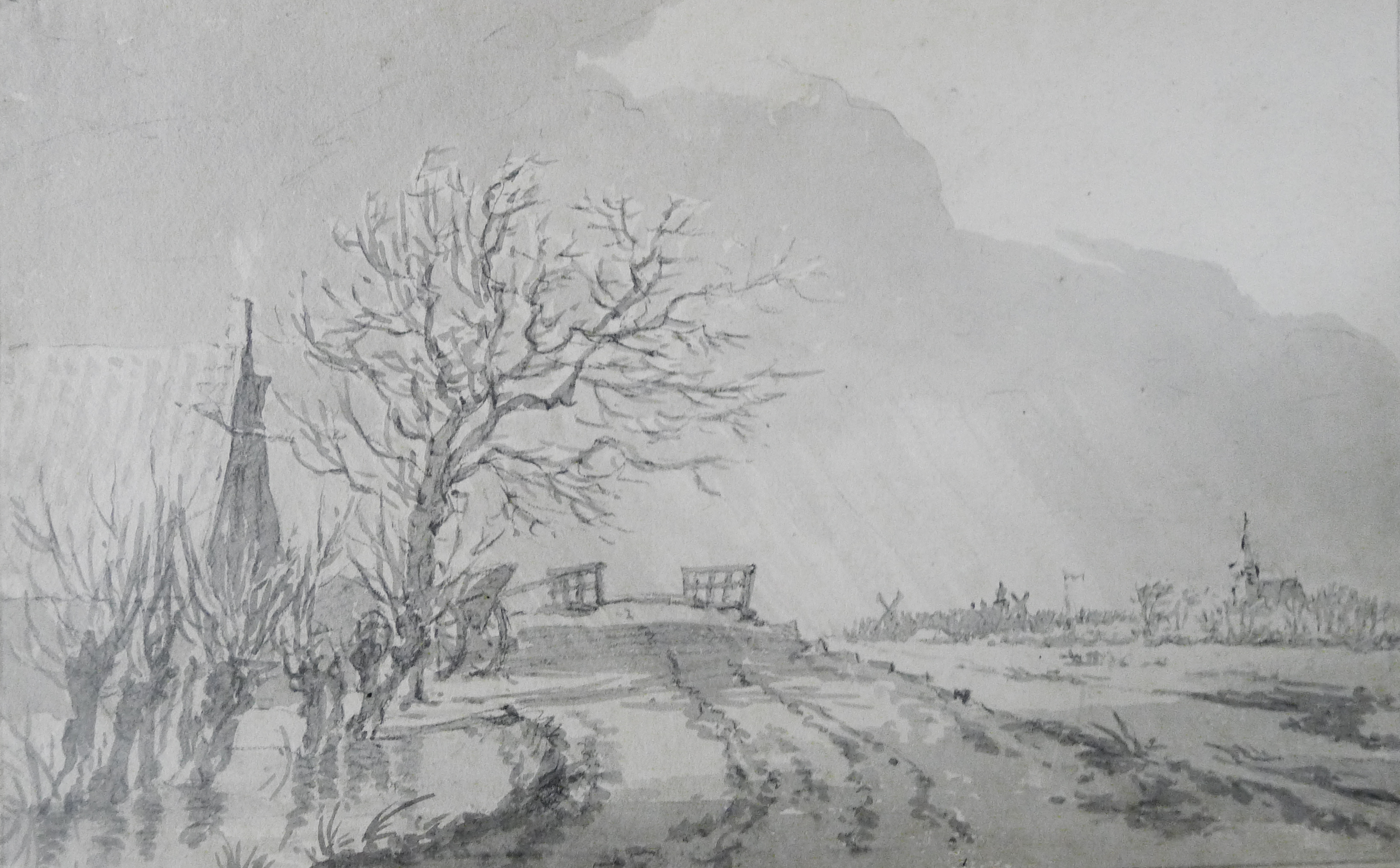 | opschrift | midden onder Middelstum buiten Groningen achterkant: Op het blad in verso: Gezigt op Middelstum buijten Groningen E. van Drielst de tekening heeft de Heer Sluijter in Couleur Egbert van Drielst 1745-1818 Ex. Coll. D. Nanninga Mzn, Groningen (1980) |