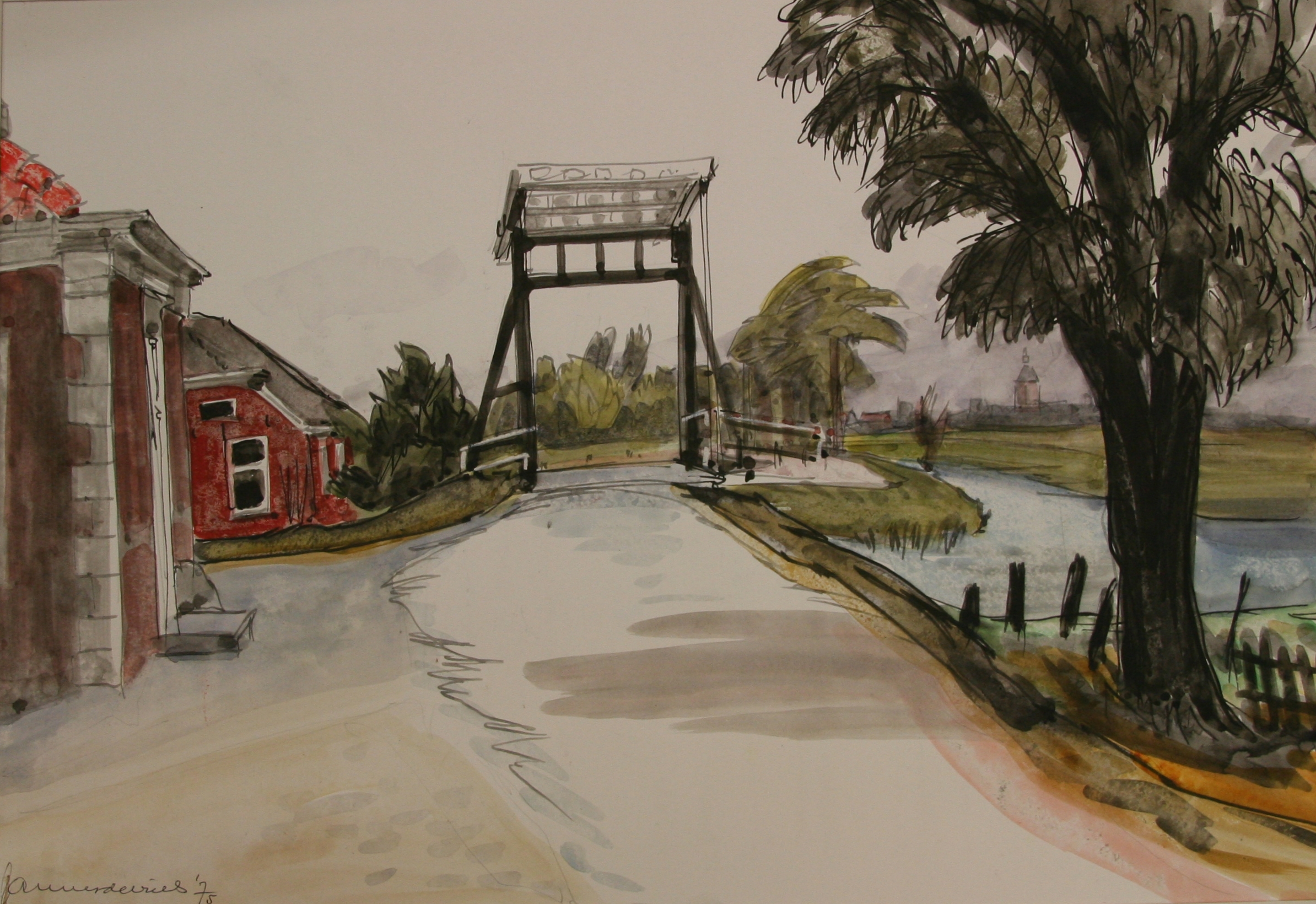 De kunstenaar heeft twee technieken toegepast, wat duidelijk te zien is. De contouren van de objecten zijn met dunne lijnen aangebracht. De ruimtes tussen de lijnen zijn met aquarel ingekleurd. Vooral bij de boom rechts is goed te zien, dat de kleuren in elkaar overlopen. De weg, het water en de lucht zijn in lichte tinten afgebeeld, waardoor deze sterk contrasteren met de donkerdere en in duidelijke kleuren afgebeelde gebouwen, bomen en brug. Door de techniek zijn er ondanks de duidelijk afgebeelde objecten niet veel details. Er is door de grote boom en de gebouwen veel diepte in de aquarel aangebracht.