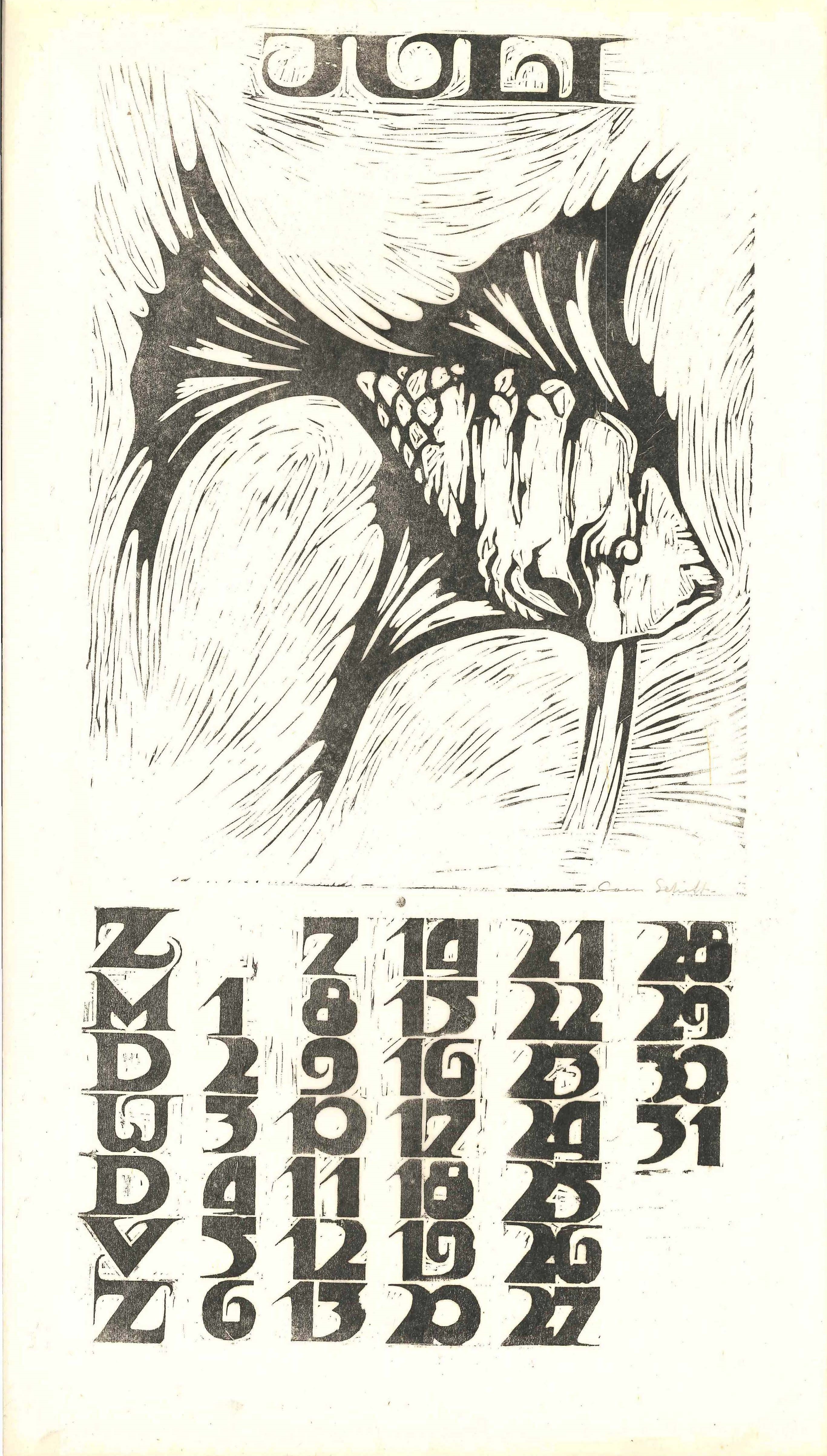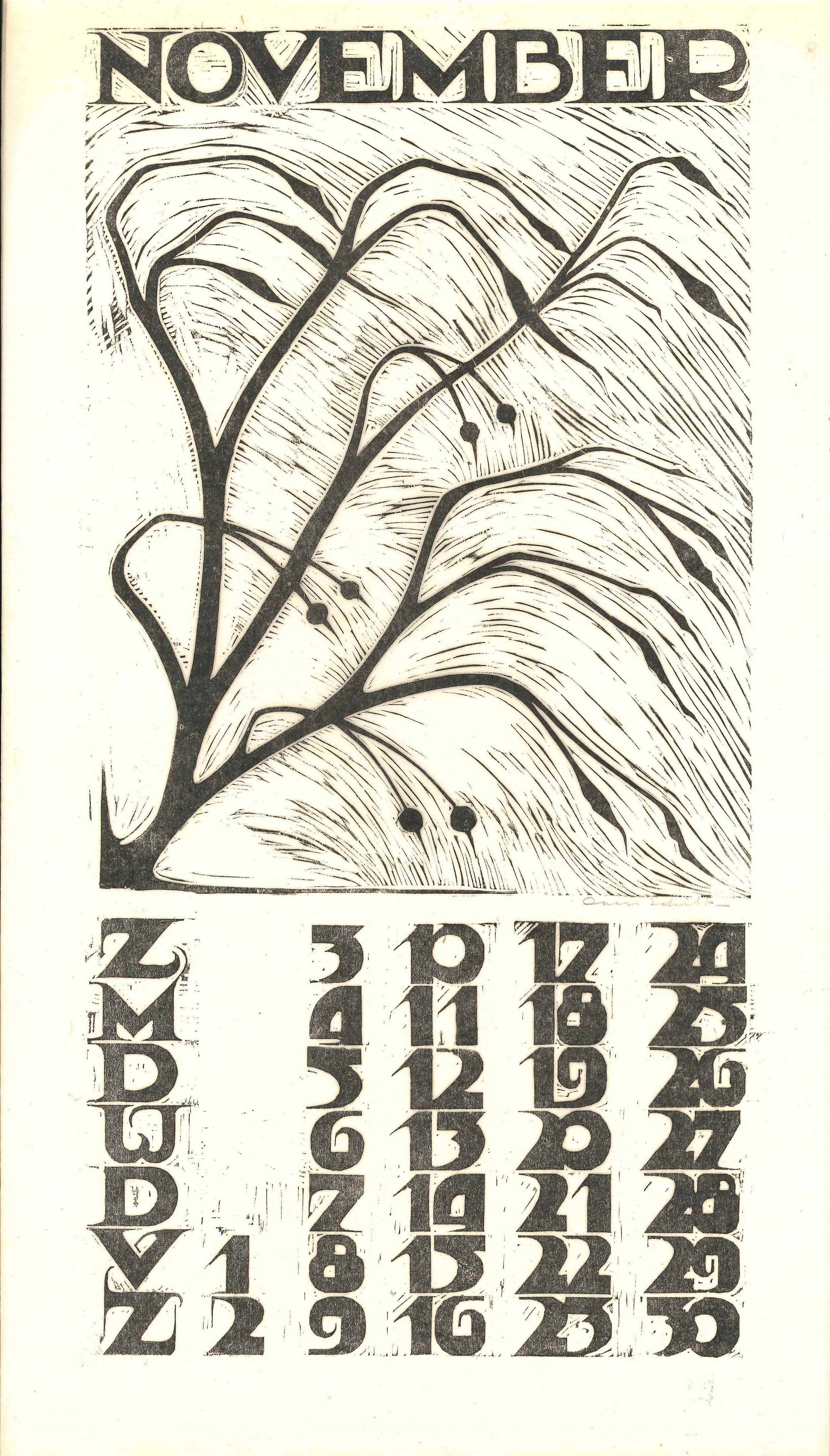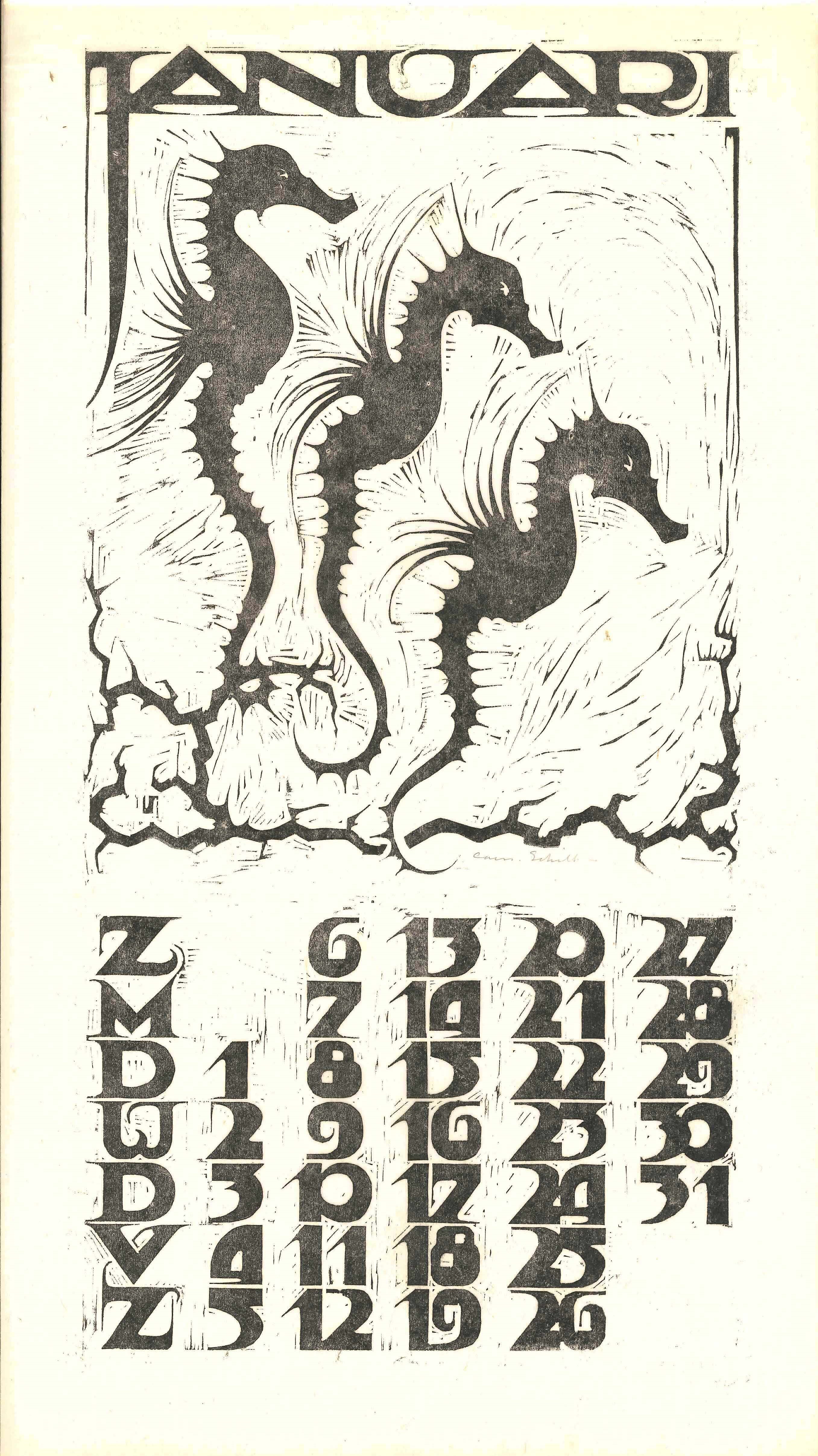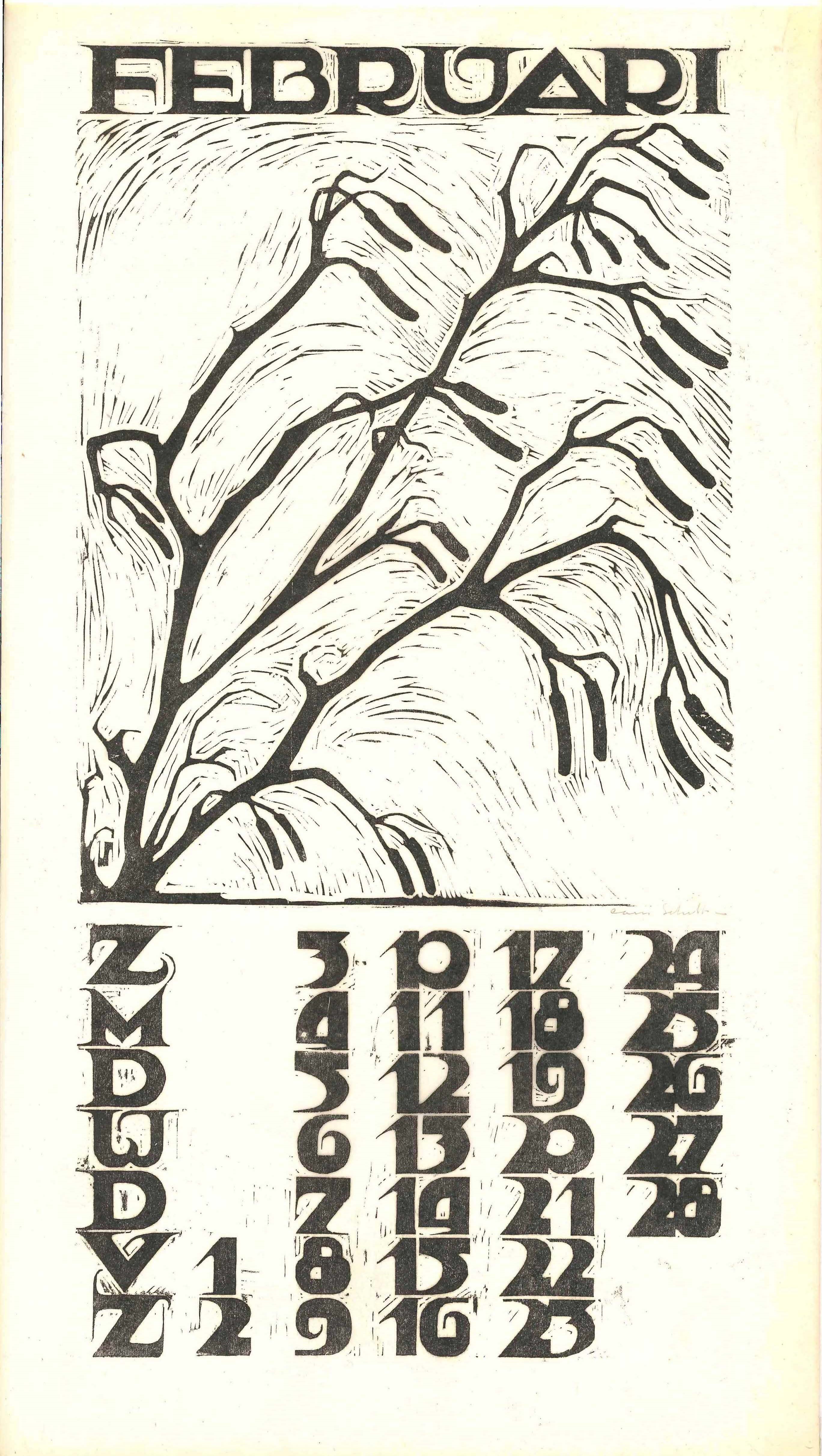 Kalender 1935 in 12 bladen en voorblad. Houtsneden op Japans papier. Alle afbeeldingen gesigneerd, gemaakt op de Academie Minerva.