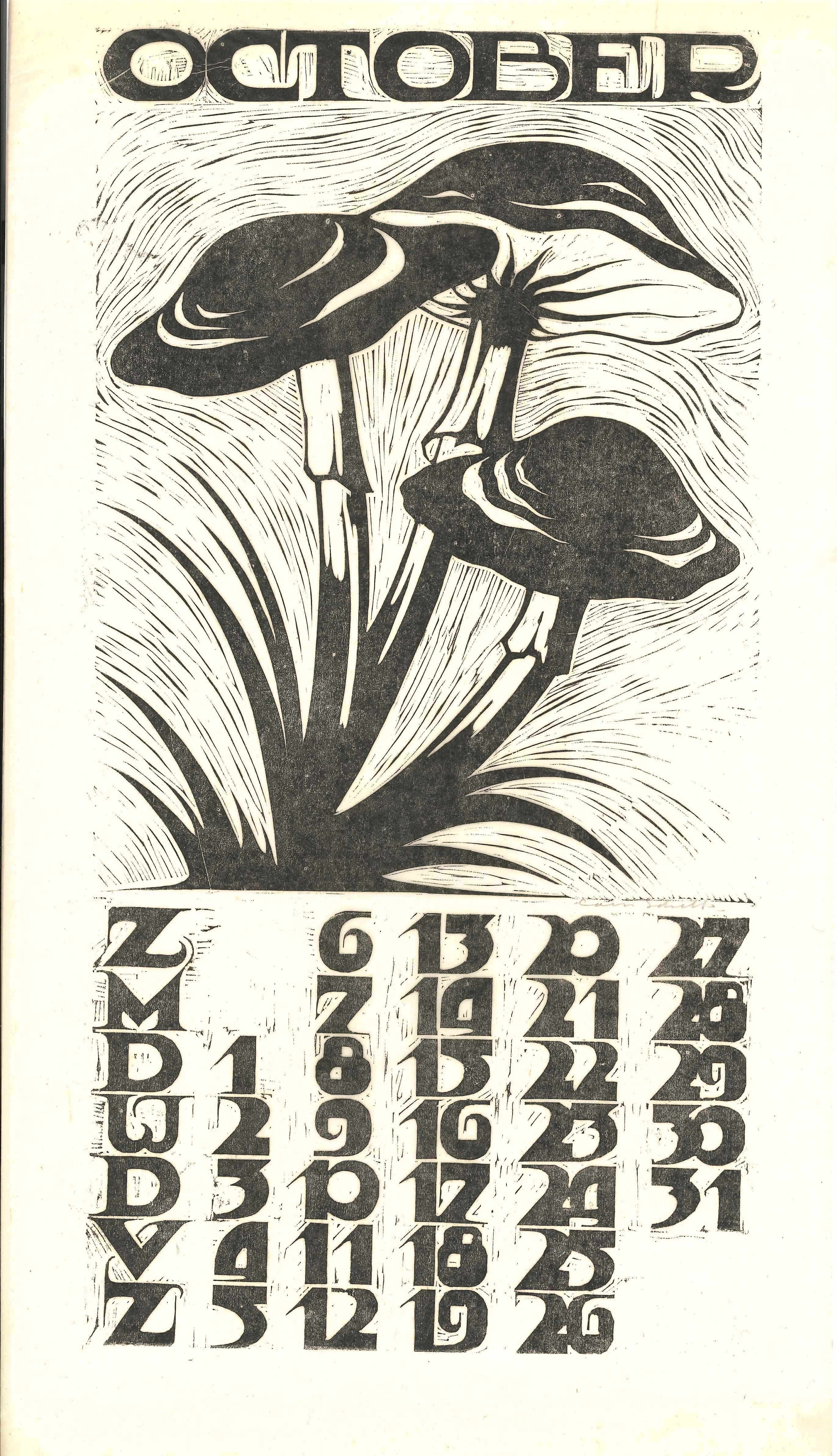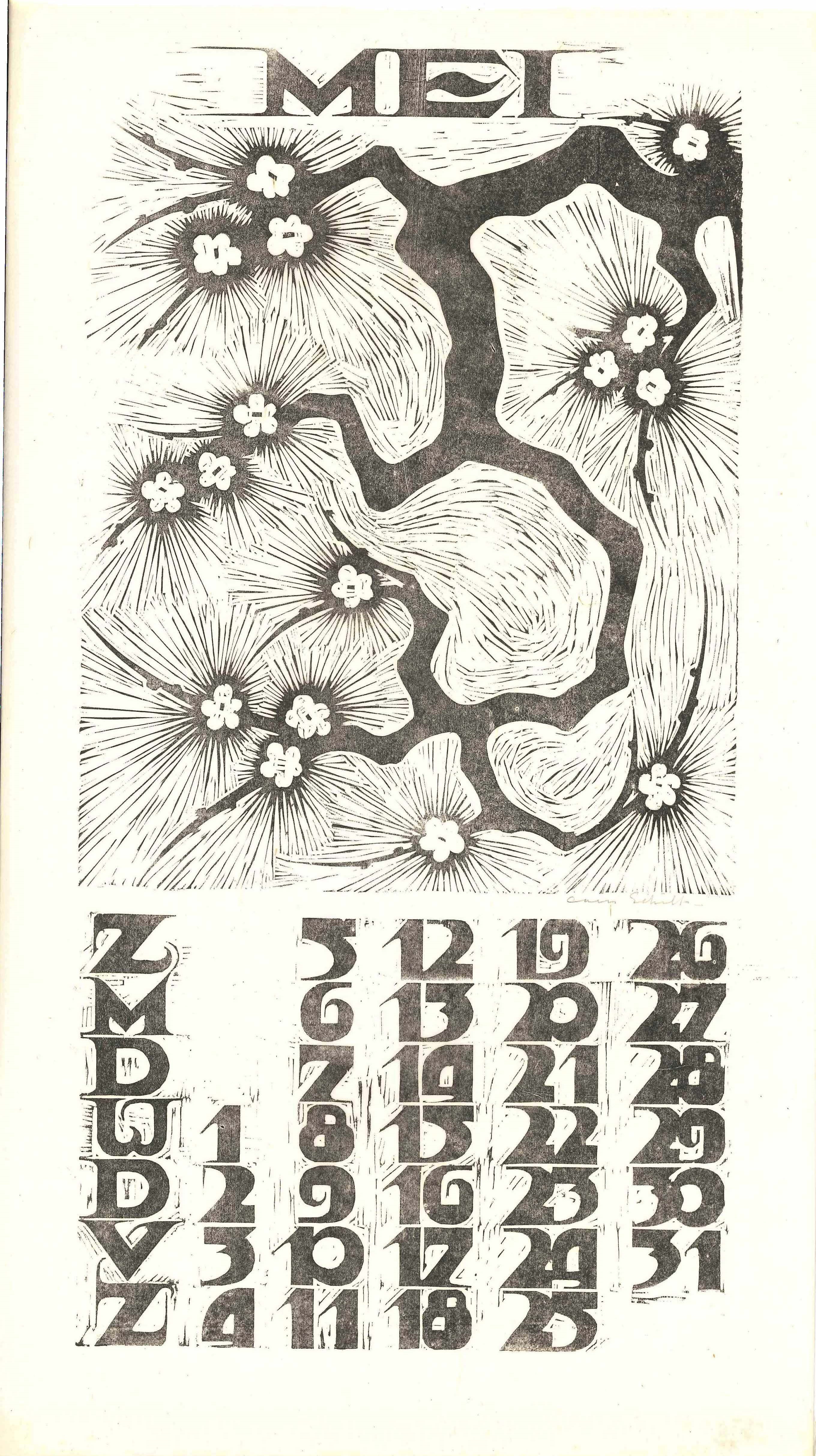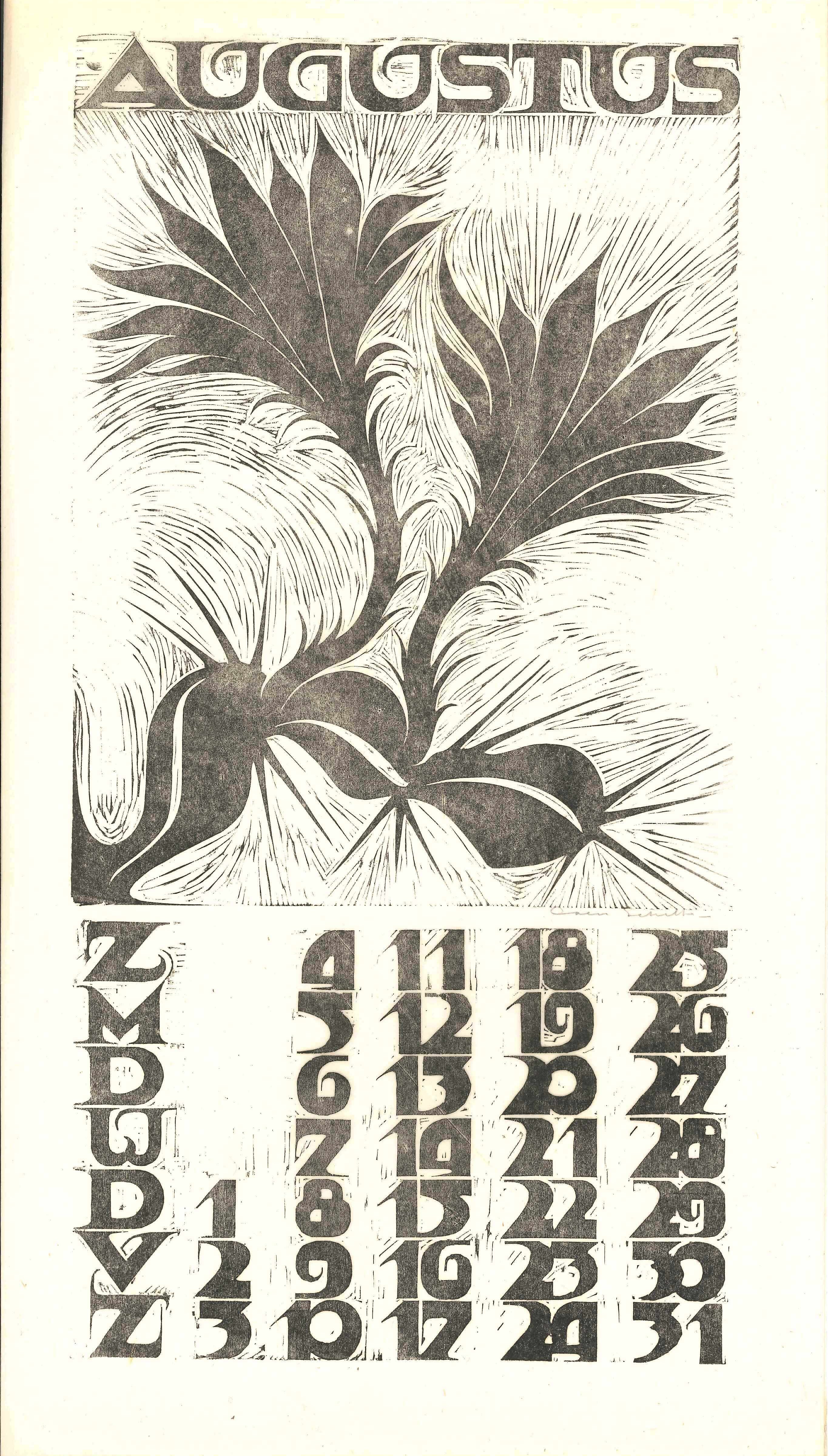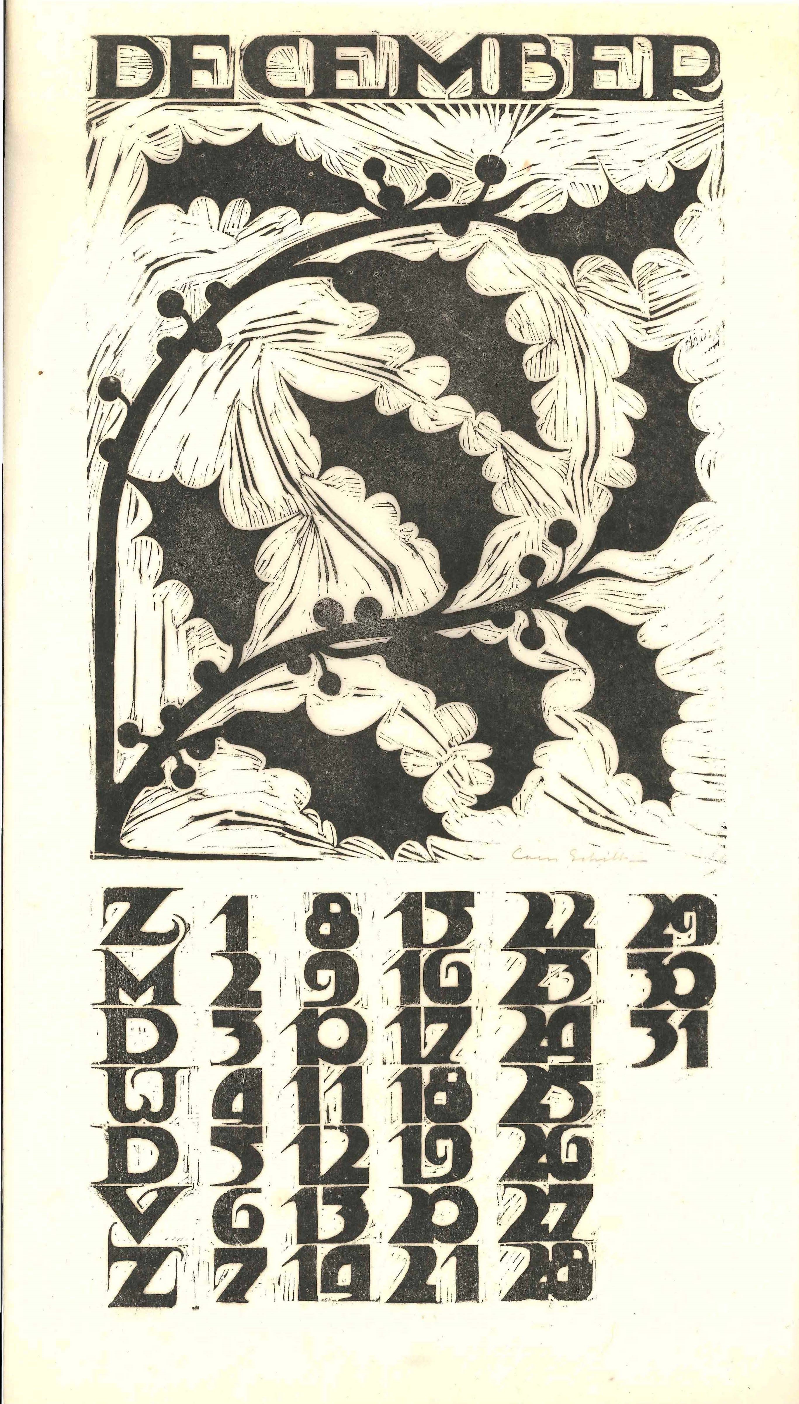 Kalender 1935 in 12 bladen en voorblad. Houtsneden op Japans papier. Alle afbeeldingen gesigneerd, gemaakt op de Academie Minerva.