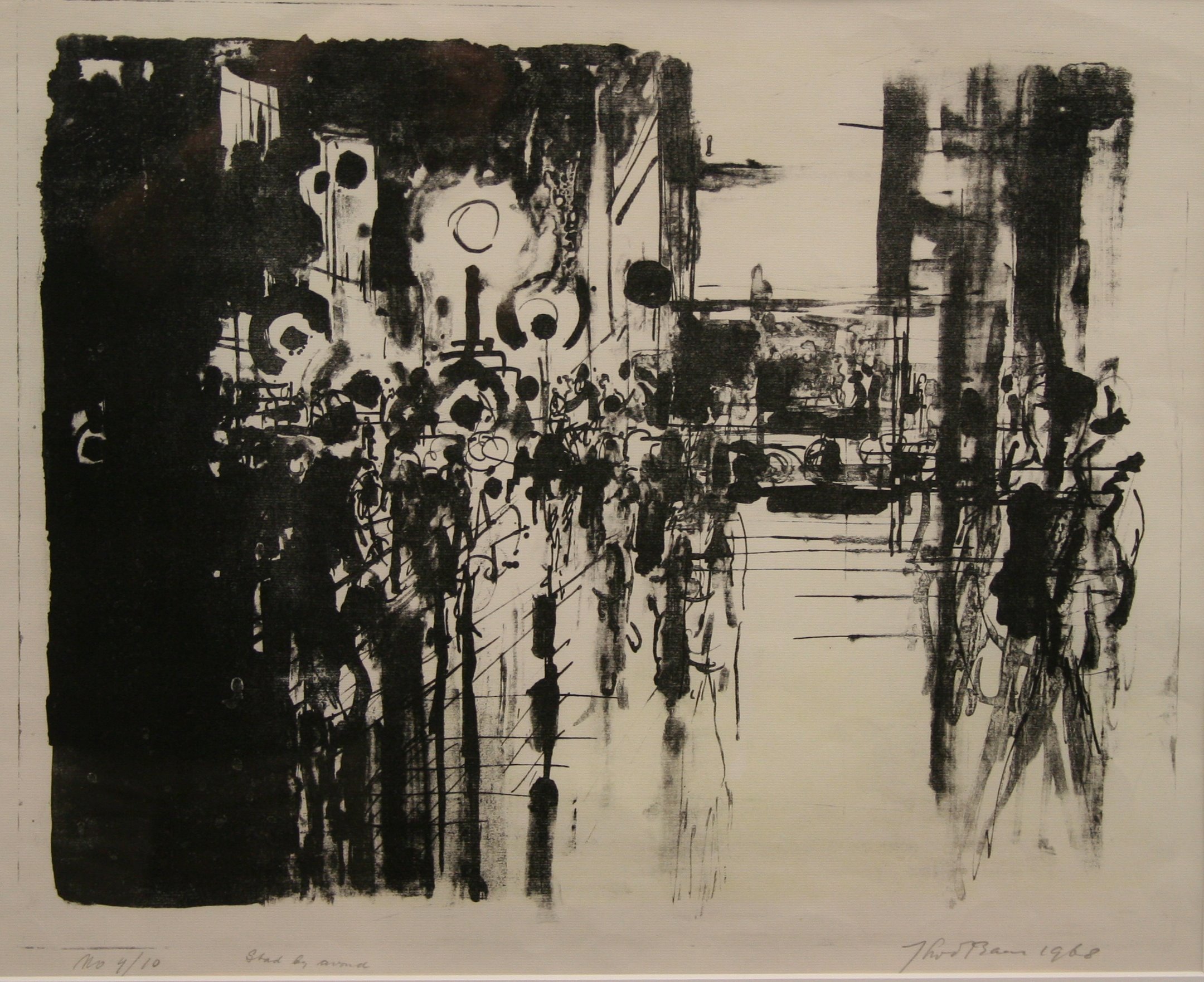 Abstracte weergave van een bepaalde locatie in een stad. Aan de rechterkant en in de linker helft zijn veel figuren waar te nemen. Alleen op de voorgrond zijn met dunne lijnen de figuren deels afgebeeld. De hoofden zijn vaak zwarte bollen. In de bovenste helft zijn enkele gebouwen zichtbaar.