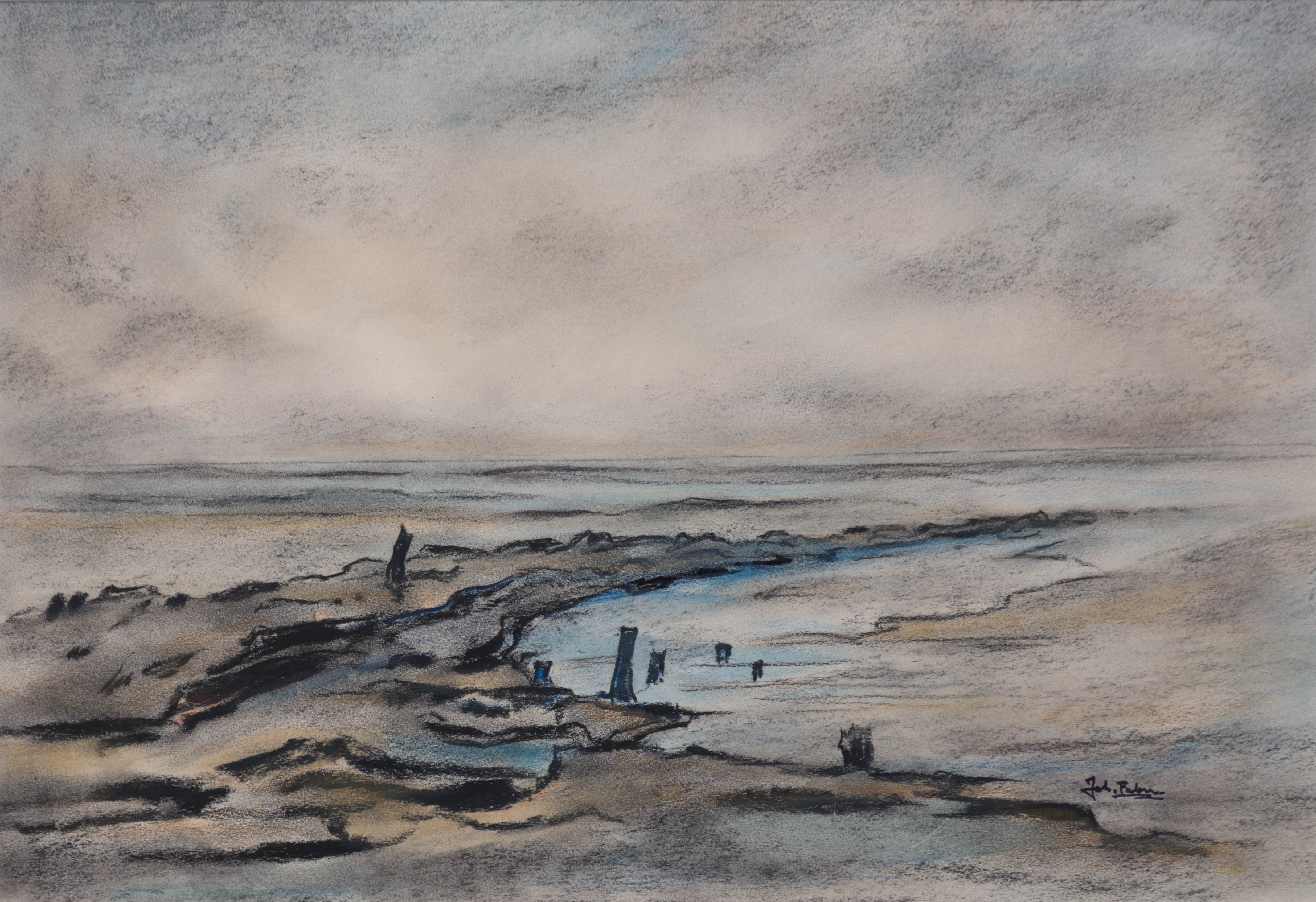 Er is enig perspectief aangebracht door de steeds smaller wordende landstrook. Door de toegepaste techniek wordt de diepte versterkt. Op de voorgrond zijn met dikke lijnen contouren van objecten aangebracht. Naar het midden toe worden deze lijnen dunner en is het aantal dikke lijnen ook minder. Met een paar dunne lijnen is de overgang tussen het wad en het water verduidelijkt. Door de weggeveegde lijnen en kleuren lopen het wad en water in elkaar over, wat in werkelijkheid ook het geval is. Door de techniek zijn er weinig details. Er is niet veel varitatie in kleur. Vooral de bruine en grijze tinten overheersen. De compositie is vrij leeg en daardoor zeer ruimtelijk.
