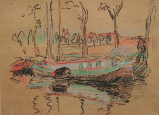 In deze pastel “Woonschepen Boterdiep” zien we de kracht van zijn tekenaarschap. Met enkele rake lijnen in zwart krijt heeft hij de karakteristieke vorm van een aangemeerde platbodem neergezet, met daarachter de boeg van een volgende boot. Het zwaard is even in zwart geaccentueerd; het weerspiegelende water met weinig middelen aangeduid. Een man op de oever is bezig de boot vast te leggen, wat het karakter van een momentopname versterkt.