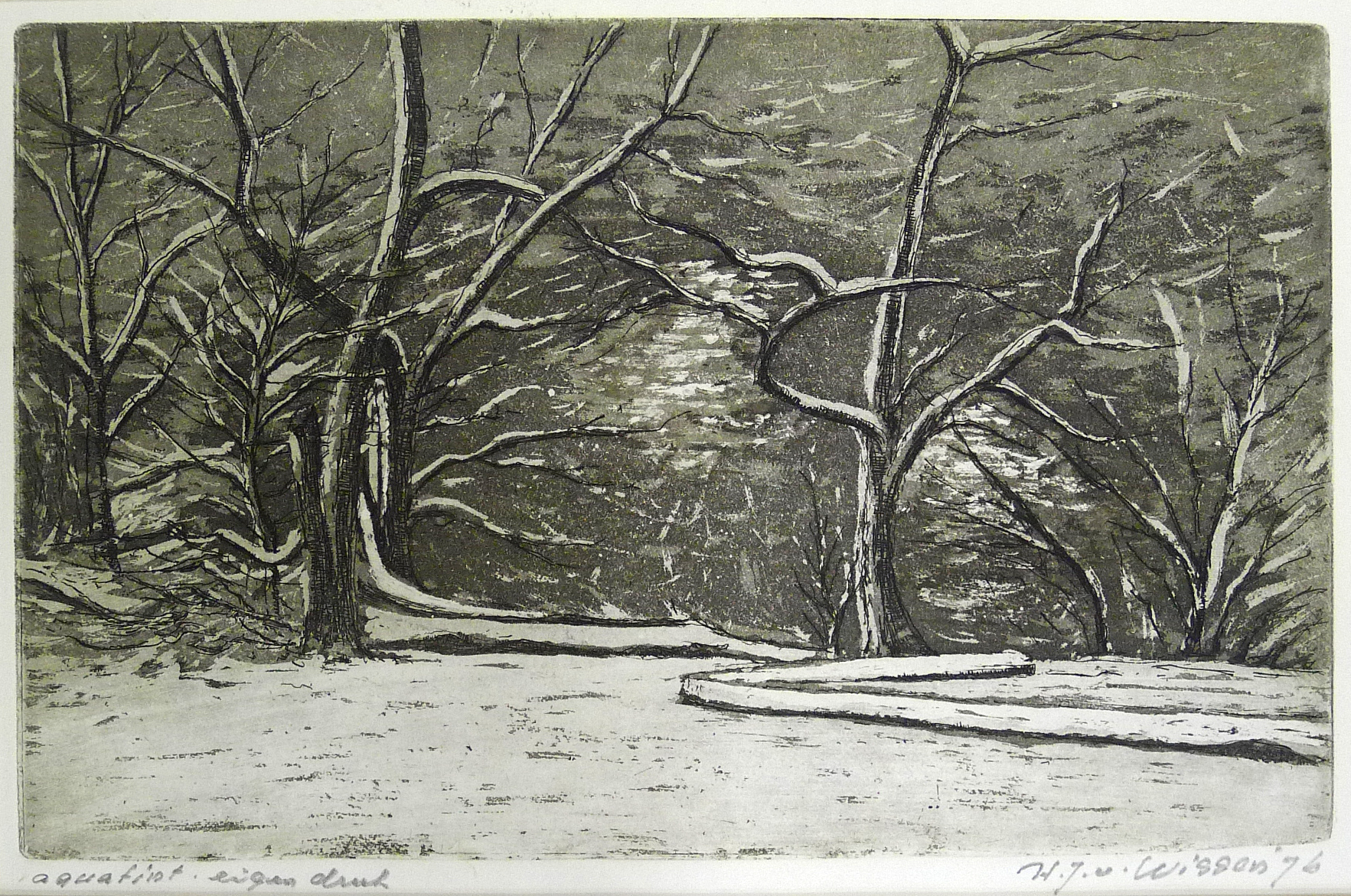 | opschrift | linksonder aquatint, eigen druk; achterkant: Aank. Pictura Tentoonstelling "De Ploeg"in huis 2-1-'78, Winter F. 150,- Herman van Wissen |