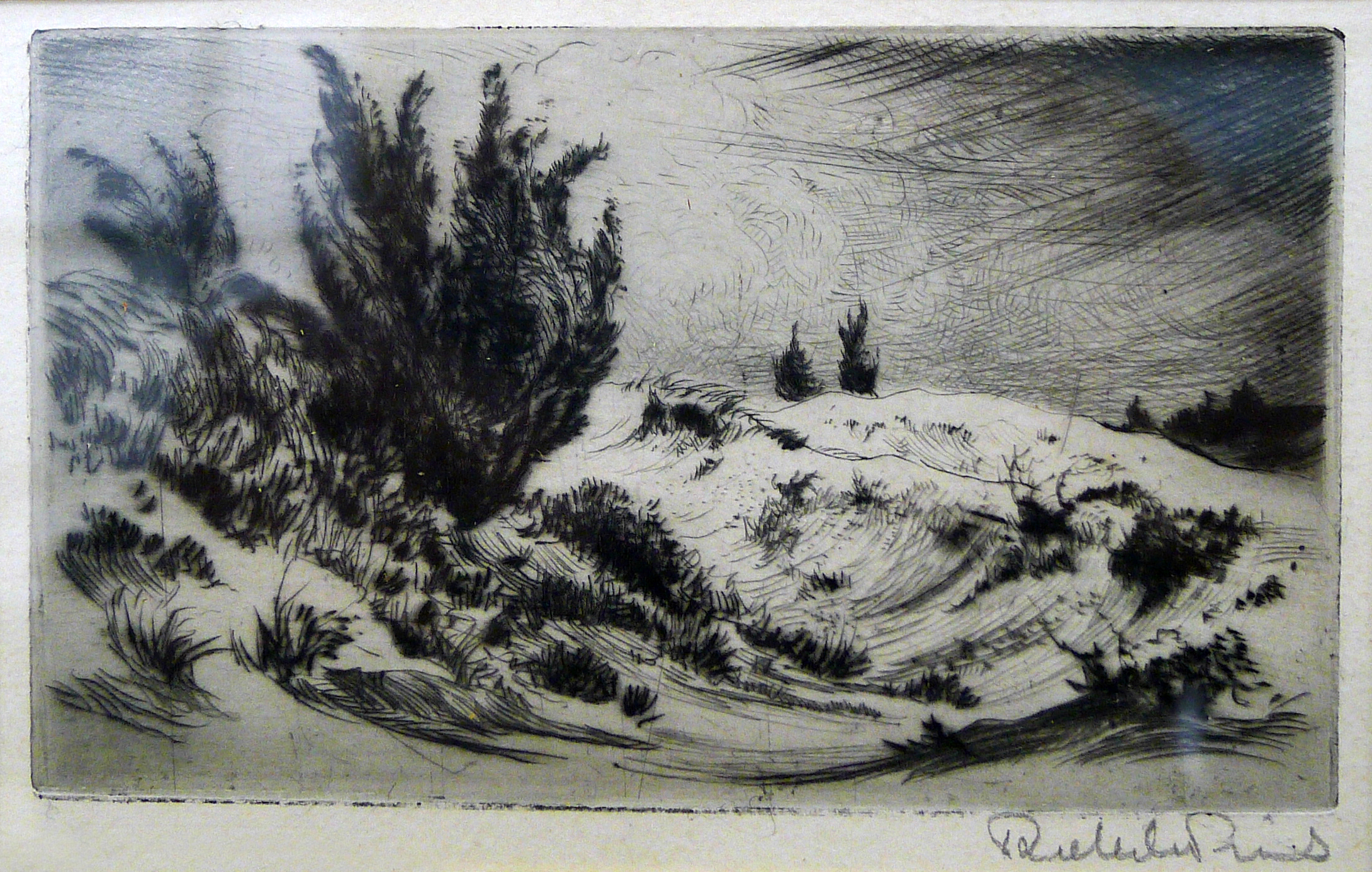 Er is enig perspectief ontstaan door de grote jeneverbes en de linker helling die voor de rechter heuvel langs gaat. De planten zijn gedetailleerd weergegeven, maar de zandverstuivingen bevatten daarentegen weinig details. Met dunne kromme lijnen zijn wel de hellingen duidelijk herkenbaar. De planten zijn donker ingekleurd, waardoor er een groot contrast ontstaat met de lichte zandverstuivingen en de lucht.